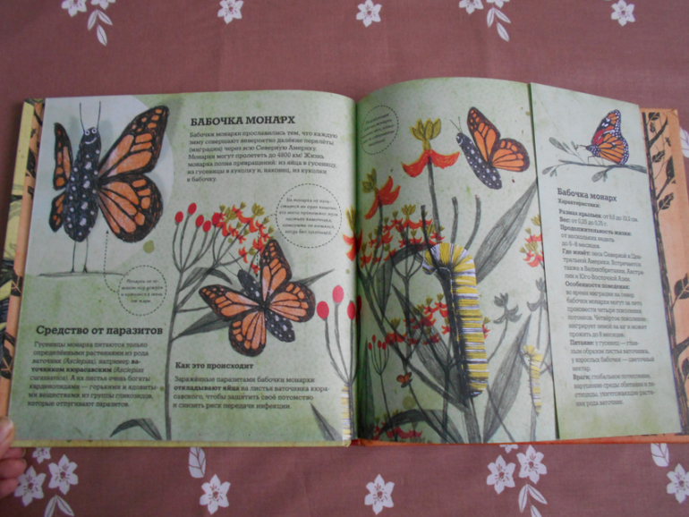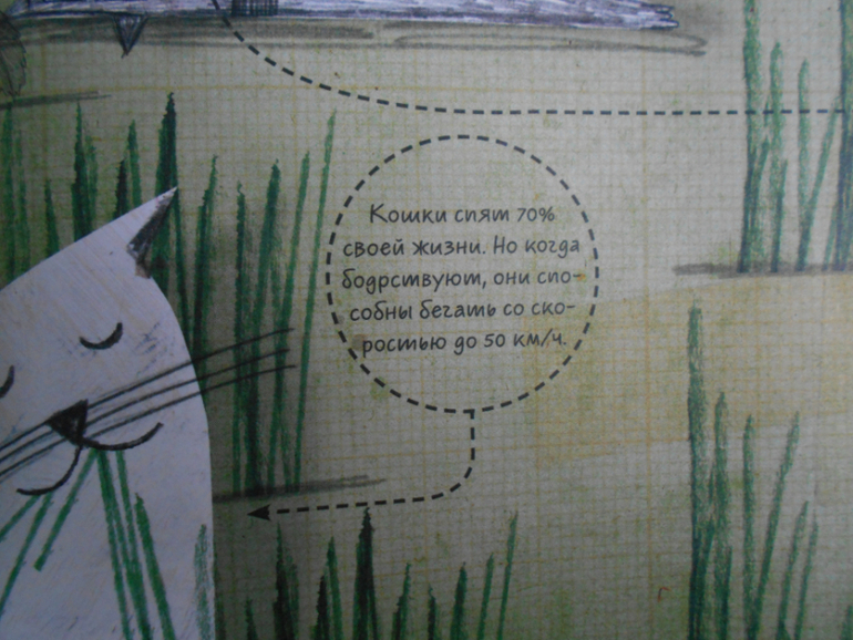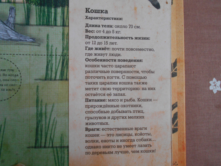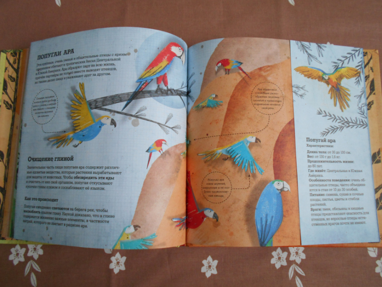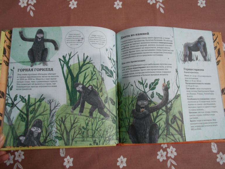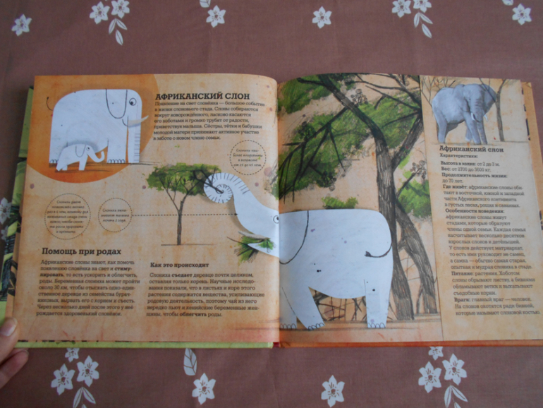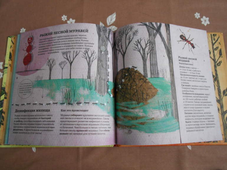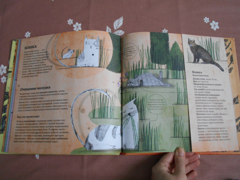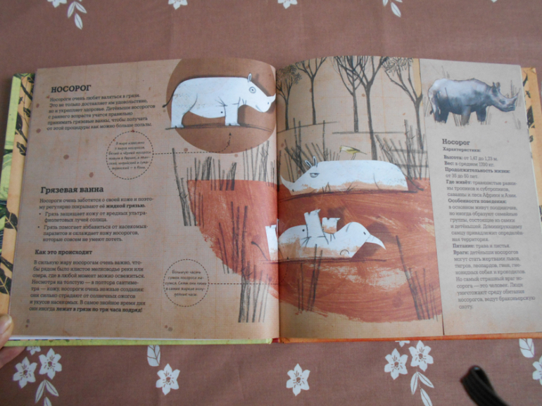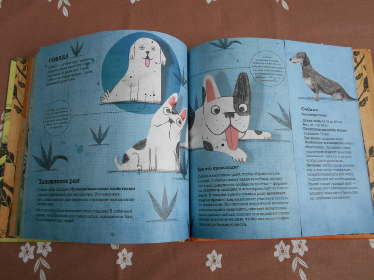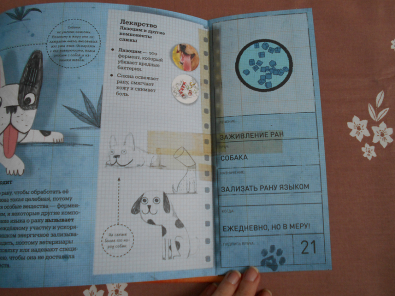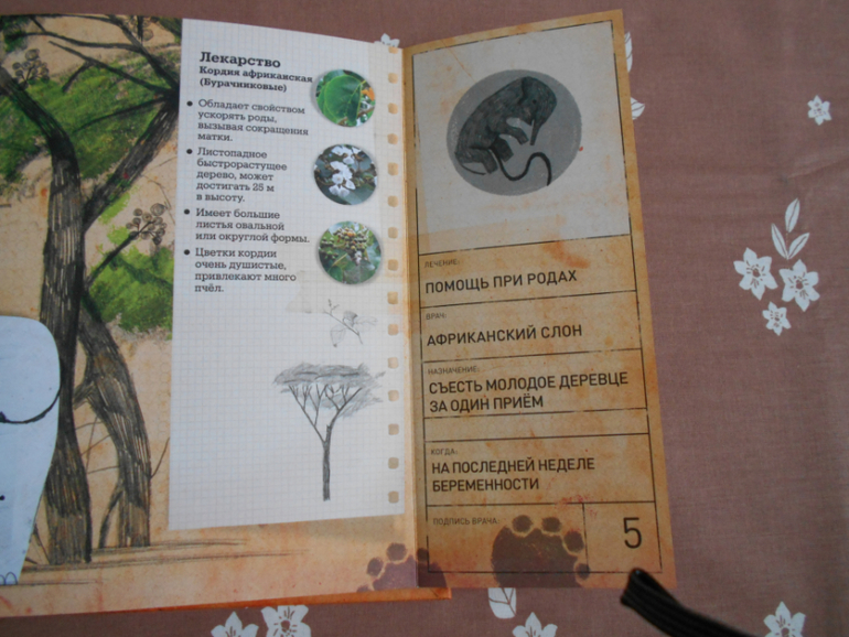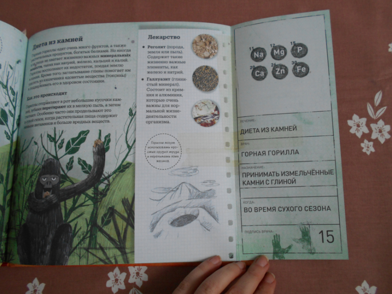 Каждому животному отводится целый разворот (всего их 14), где можно узнать о том, от чего лечится животное, как это происходит, информация о лекарстве (растении) и другие интересные и познавательные факты из жизни животного. На каждом развороте справа есть открывающийся клапан, на котором находятся характеристика животного - вес, размеры, питание, место обитания, продолжительность жизни, поведение и враги, а также назначение врача с печатью - лапкой животного) Очень забавно читать эти назначения - скоблить глину языком или ванна с муравьиным шампунем, такой юмор могут оценить, конечно, дети постарше!