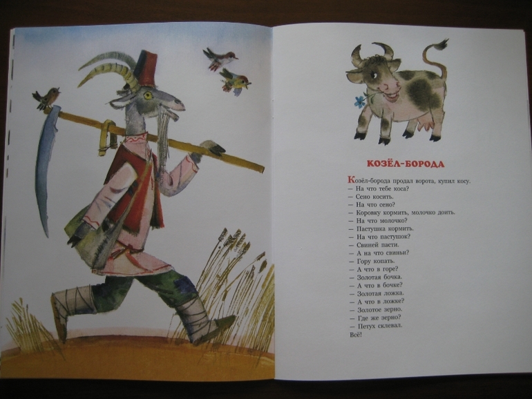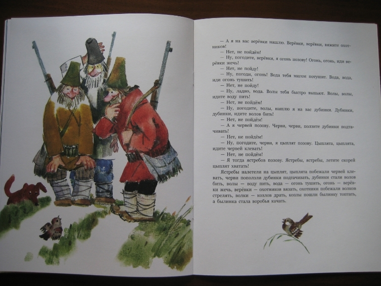 Тонкая книжка на скрепке оказалась, во-первых, не такой уж тонкой, не 12 страниц, а во-вторых, это не одна сказка, а целый сборник белорусского народного фольклора. Сказки короткие - буквально на полстранички, за исключение двух - "Воробей и былинка" и "Глупый волк", они побольше. Мне кажется, это удачный вариант для чтения самым маленьким, которые еще плоховато слушают и не выдерживают чтения длинных текстов, это во-первых. Во-вторых, их хорошо читать на ночь - ребенок не успеет разгуляться, выскочить из постели, побежать к игрушкам... :) Ну а в-третьих, это оптимальный размер текста для начала самостоятельного чтения - целое законченное произведение, с одной стороны, и очень короткое - с другой.