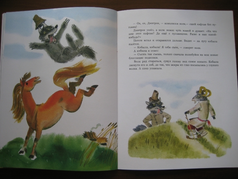 С пересказами Маргариты Долотцевой раньше вроде бы не приходилось встречаться ("Крошка Енот" у нас не в ее пересказе), но здесь понравился: без сложных оборотов, без длиннот, без словечек, требующих подстрочных примечаний, коротко, но емко и даже где-то с юмором :) Вот, например, сказка, давшая название всему сборнику, - "Лиса и тетерев":