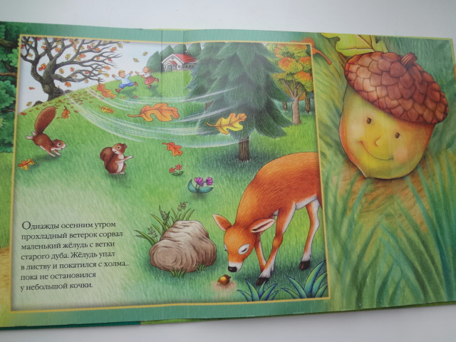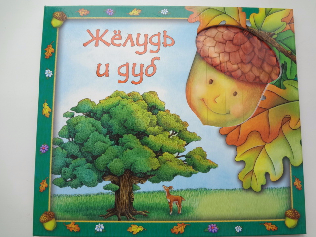 Сын нашел нашу старую "засыпательную" книгу, которую читали больше года назад. "Желудь и дуб". Книга оказалась долгоиграющей, вернемся к ней еще. Игровой элемент очень нравится А. Страницы из плотного картона соединены между собой так, что увеличиваются в размере по возрастающей. И когда их листаешь, создается иллюзия превращения маленького желудя в могучий дуб. Сыну очень нравится листать и наблюдать такое превращение.