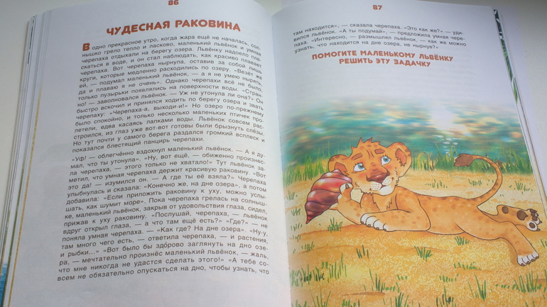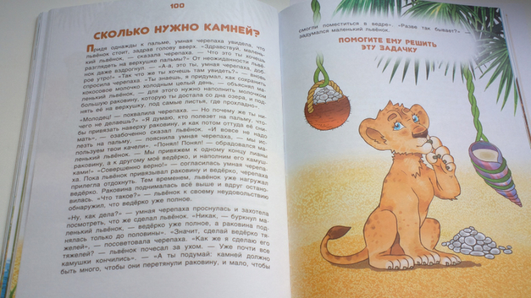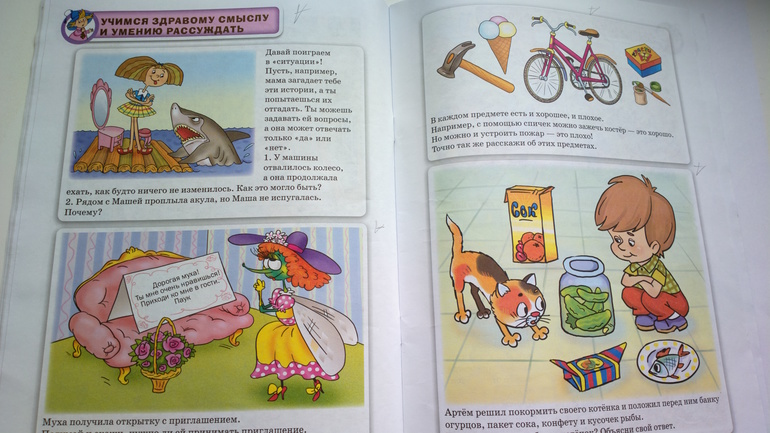 Не скажу, что все задачи решаются с легкостью, в некоторых даже взрослому надо подумать. Например, сказка про бабочку( прикреплю ото разворота), в ней надо ответить что же так испугало львенка. Не знаю всем ли об этом ответе известно, но мы с ребенком этот ответ знали, т.к накануне читали энциклопедию про бабочек.