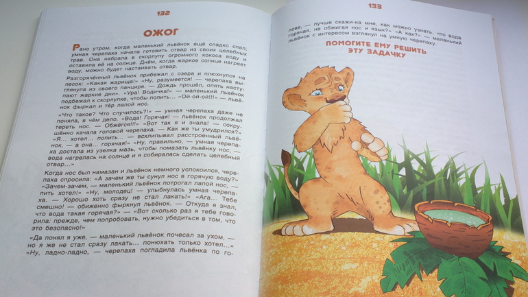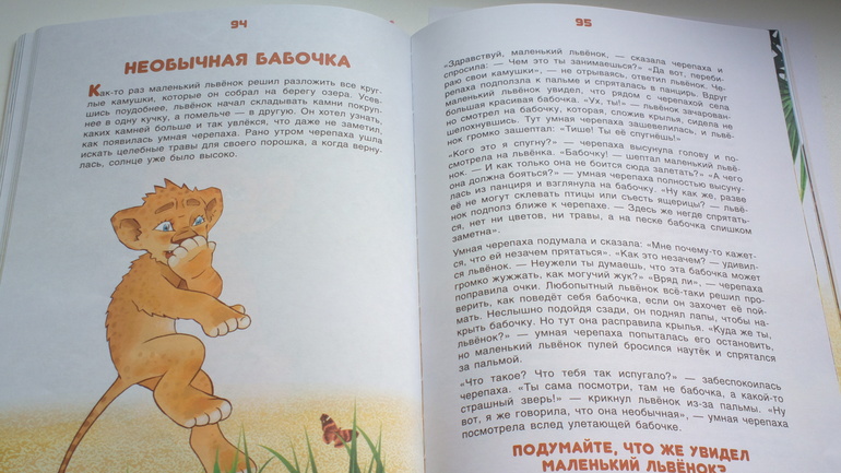 Каждая история заканчивается вопросом.Ребенку хочется помочь львенку и ответ приходит сам собой.