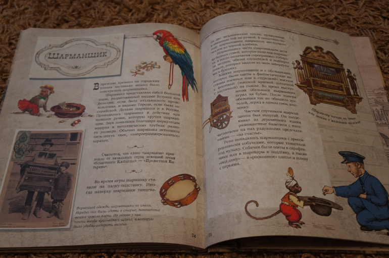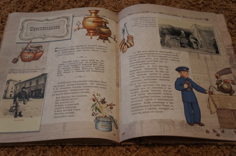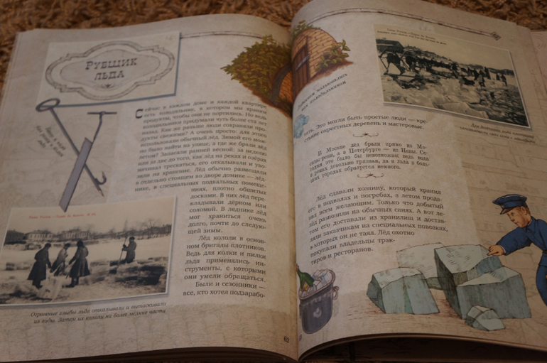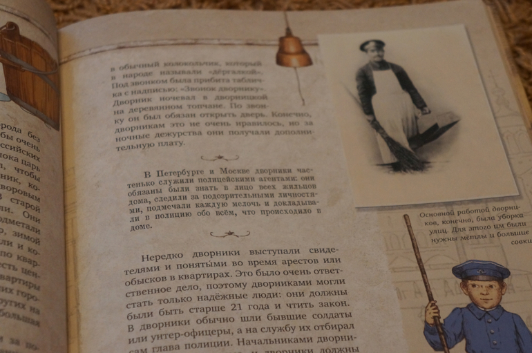 Авторы рассказывают о 30 старинных профессиях. О "типах", которых можно было встретить на улицах старой России. Текста достаточно для понимания и составления мнения о каждой профессии. На каждую профессию отводится 1-3 разворота, текст дополняют фотографии и рисунки. Именно фотографии нас "зацепили" больше всего. Рисунки рисунка, а вот фотографии совсем другое дело... они передают дух того времени и всю правдоподобность... Первым делом мы рассмотрели каждую фотографию, а только потом стали знакомиться с книгой подробнее.