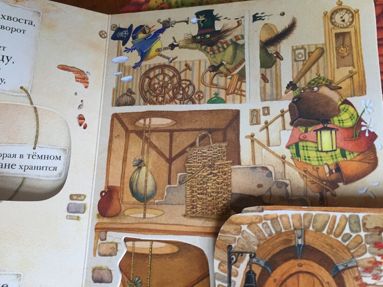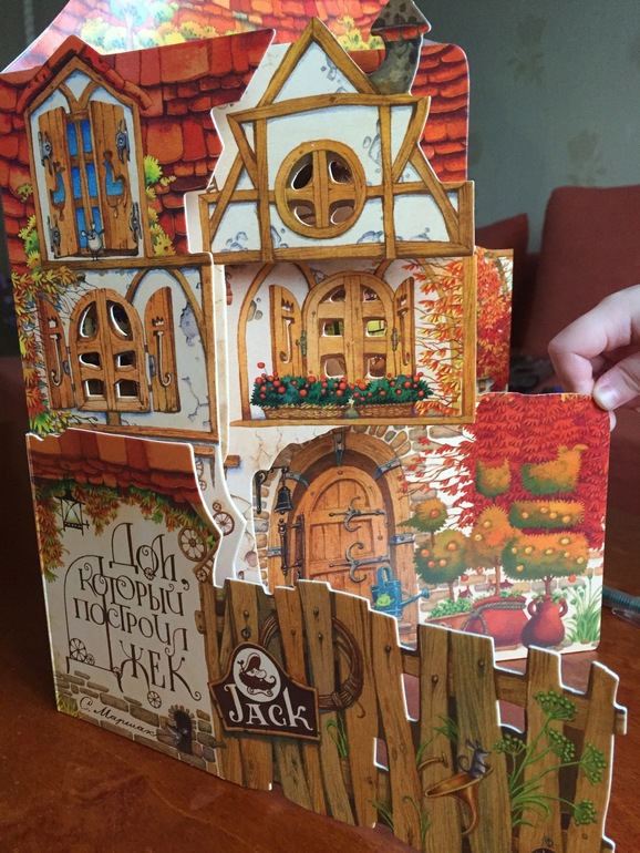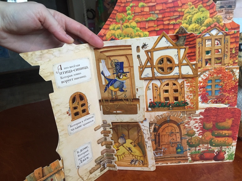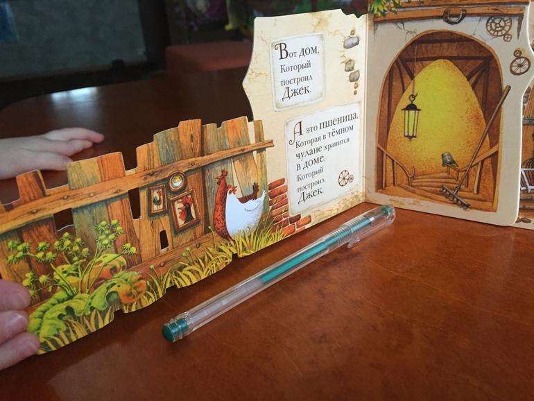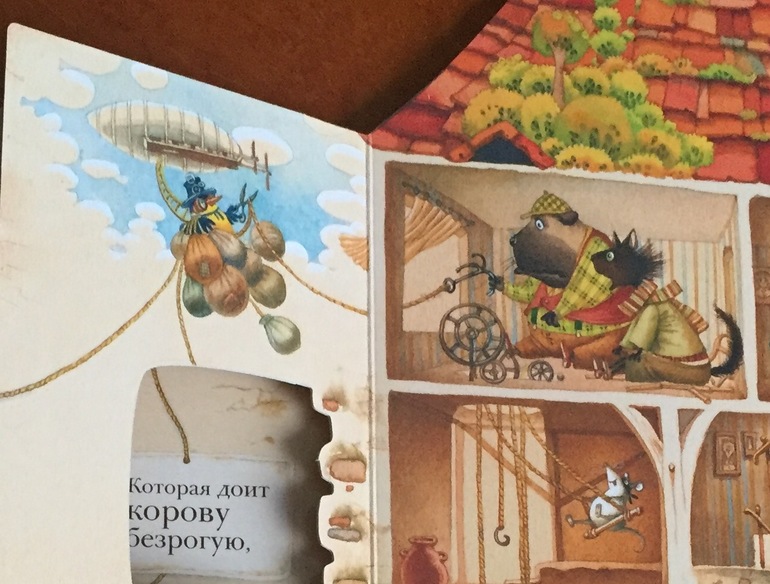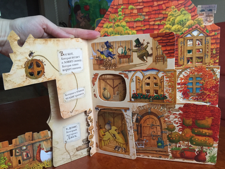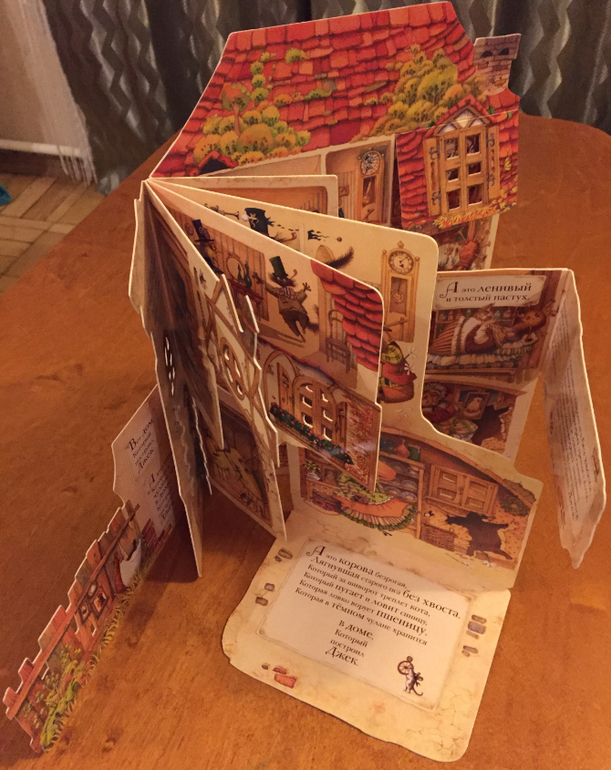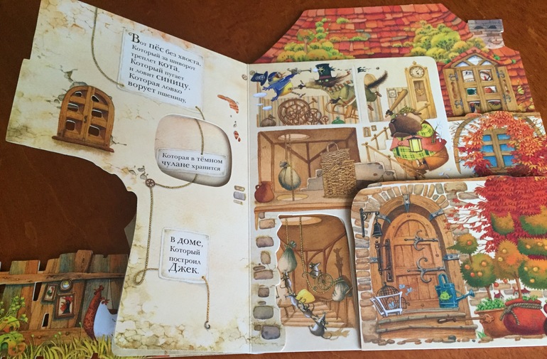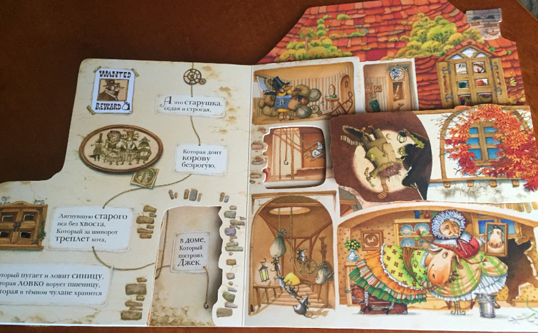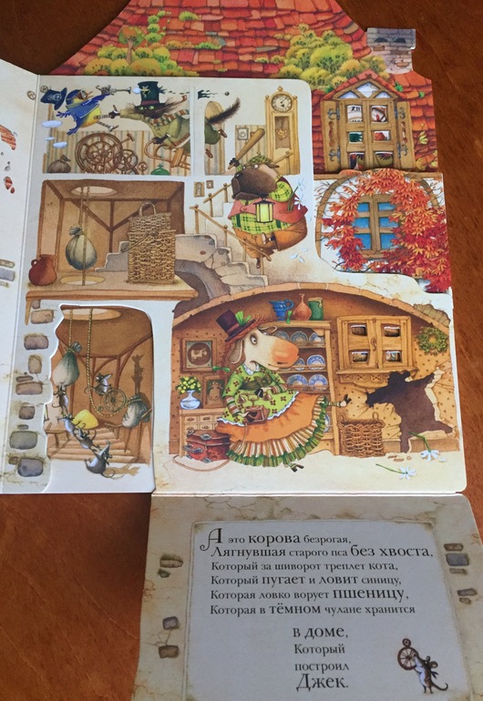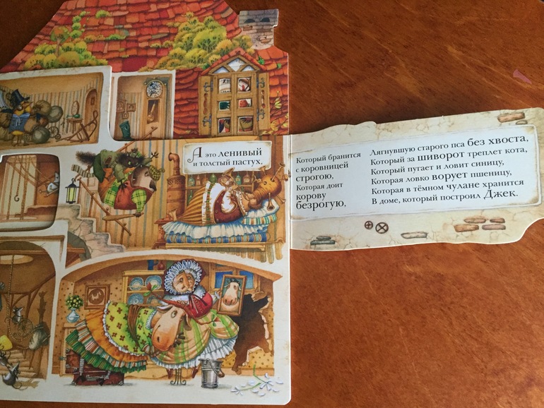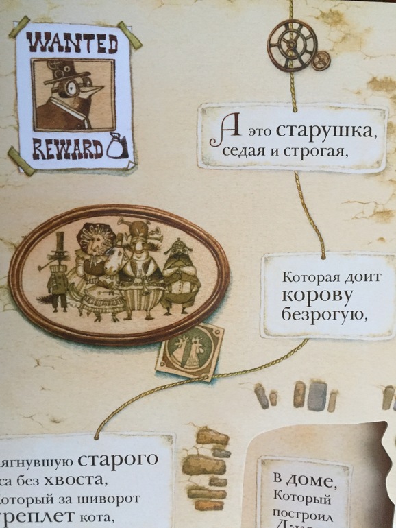 Кстати, видела, кто-то писал, что в одном месте пропущена строчка "В доме, который построил Джек". ЭТО НЕ ТАК. Текст организован таким образом, что часто повторяющиеся строчки нужно читать "в прорезь", на самом деле они написаны на предыдущей странице. Но порядок чтения указан "подсказками" - нарисованными канатами-веревками, тянущимися от куплета к куплету.