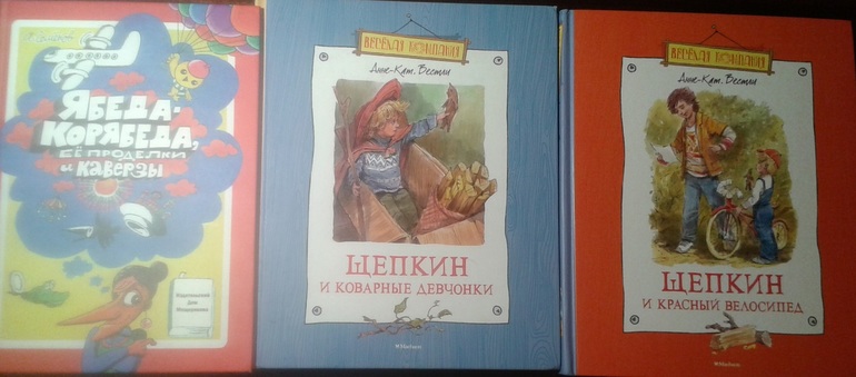 24. Две книги Анне-Катрине Вестли про Малыша и Щепкин. Щепкин и коварные девчонки. Щепкин и красный велосипед. Читали по очереди, но больше я. Книги понравились, добрые у Вестли книги.