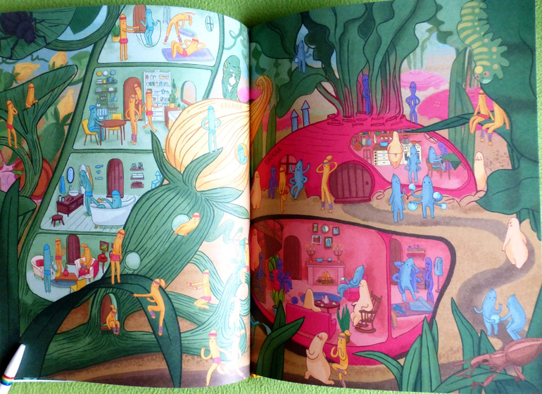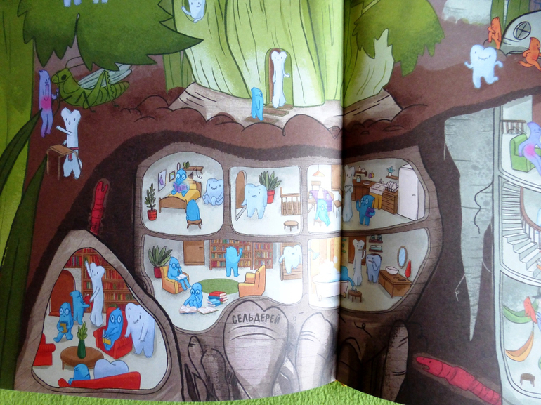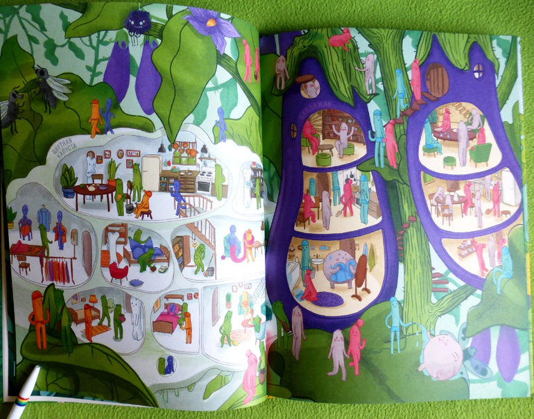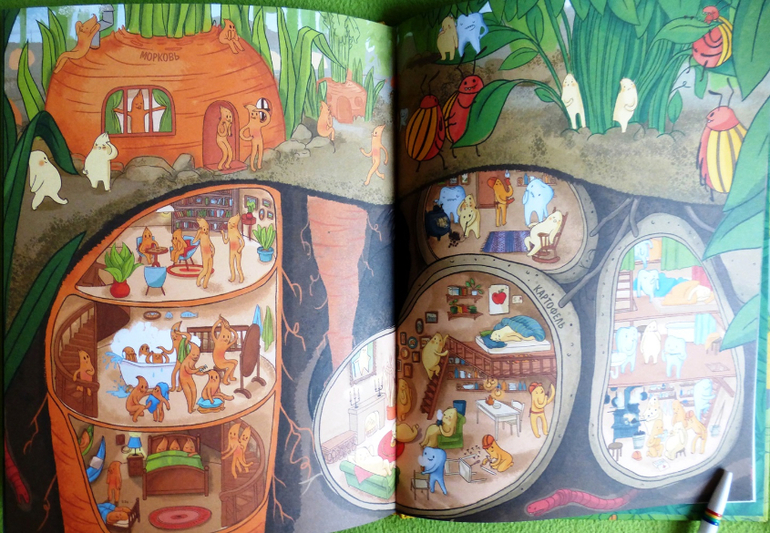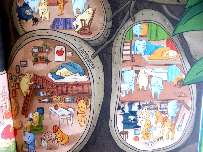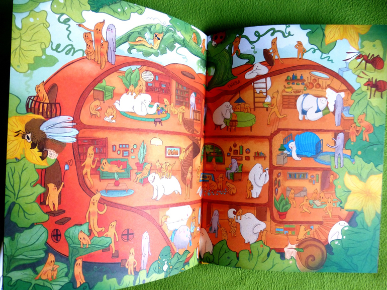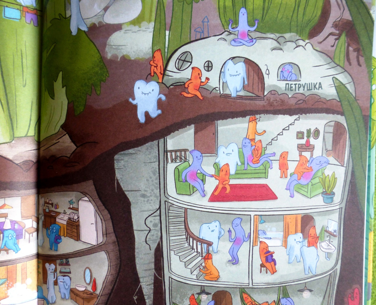 С книгой можно играть. Предложите ребенку искать на страницах витаминки или какие-то мелкие предметы, считать, сколько тех или иных жителей в домике, рассказывать истории про дружбу милых героев.