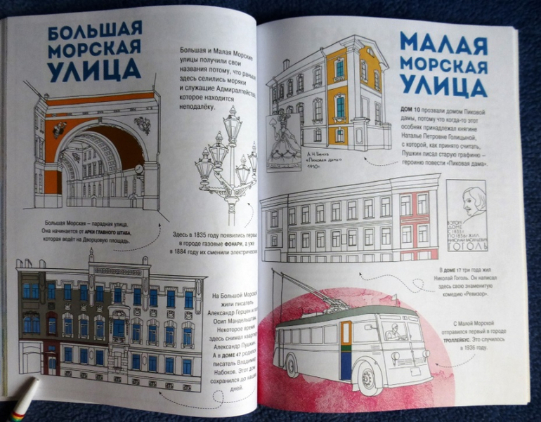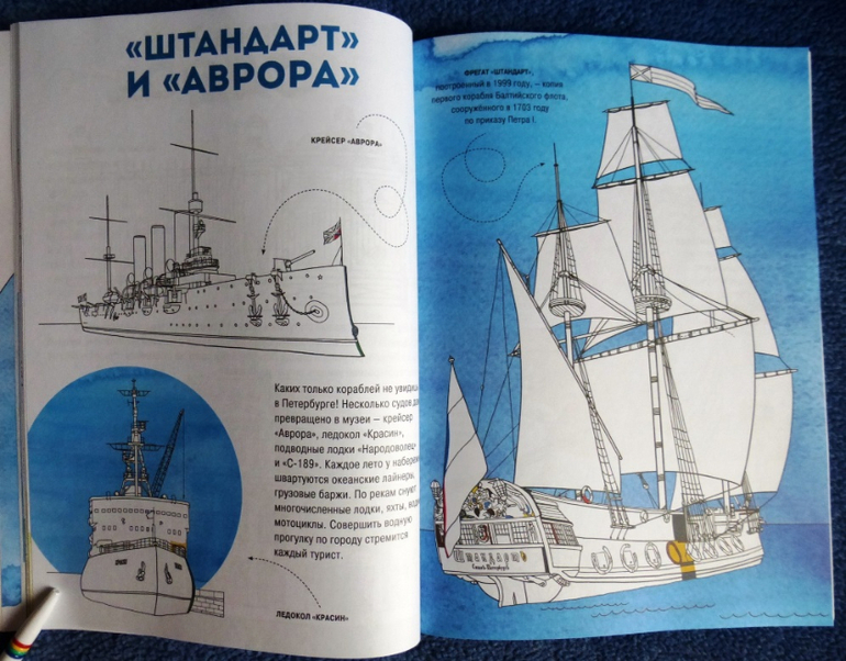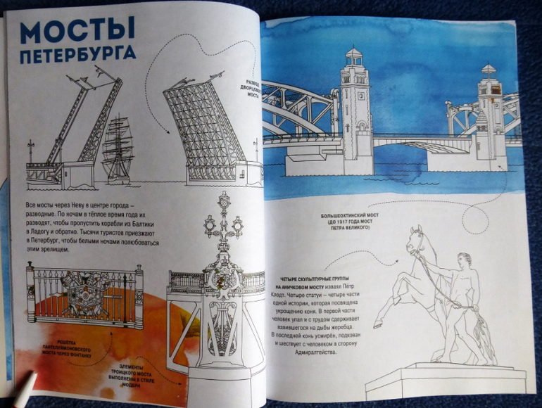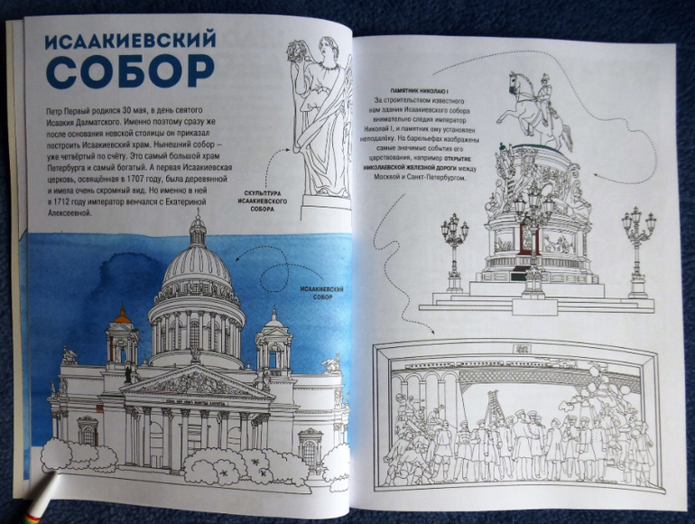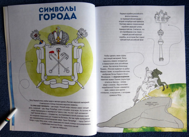 Раскрашивая здания, памятники и людей ребенок сам увидит, как оживёт чудесный город. Цветовые обозначения подскажут, какие краски выбрать, подписи к рисункам помогут узнать много интересного даже тем, кто хорошо знает Северную столицу.