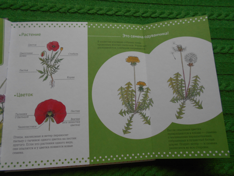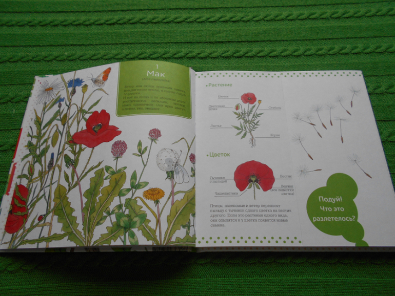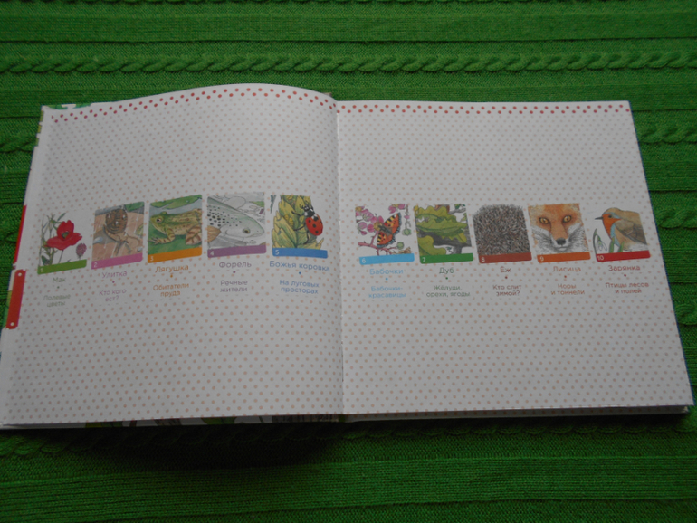 Сначала идет разворот с клапаном, где подробно рассматривается растение, либо животное/насекомое - его строение, размножение, привычки или особенности. Более подробно там представлены - мак, улитка, лягушка, форель, божья коровка, бабочка, дуб, ёж, лисица, зарянка.