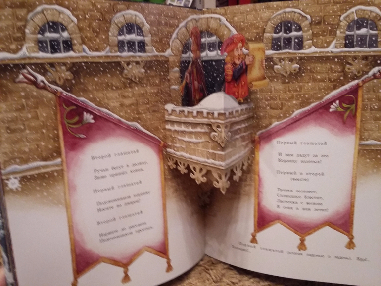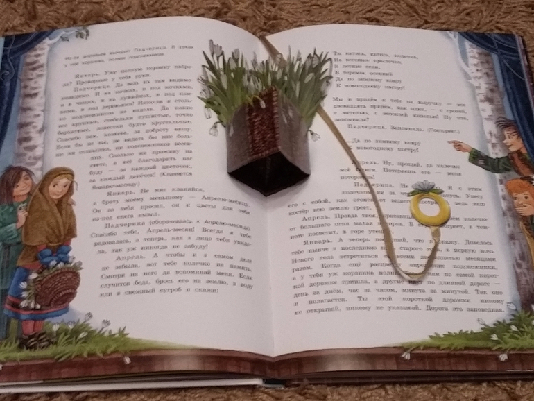 Волшебное издание с множеством приятных сюрпризов, панарамок и секретов. Впечатляет объемная вьюга, глашатаи на балкончике, огромная королевская елка и дворец. Думаю, каждый малыш мечтает примерить волшебное колечко Апреля. В этой книге есть колечко, которое можно надеть на пальчик.