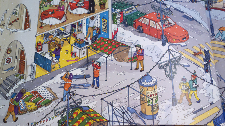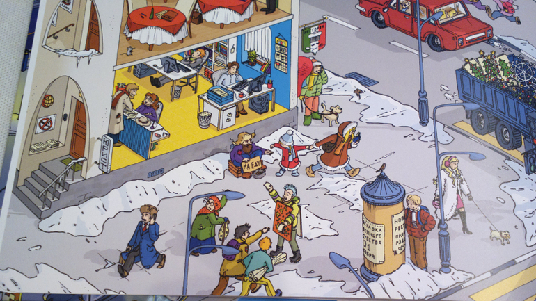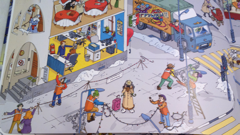 На каждом развороте перед нами предстает городок, жители которого готовятся к празднику.