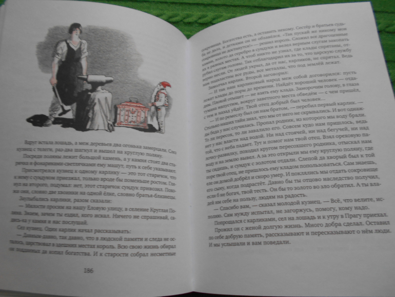 Рисунки трехцветные, в основном небольшие в начале сказки, и в больших сказках есть рисунки на полстраницы или страницу.