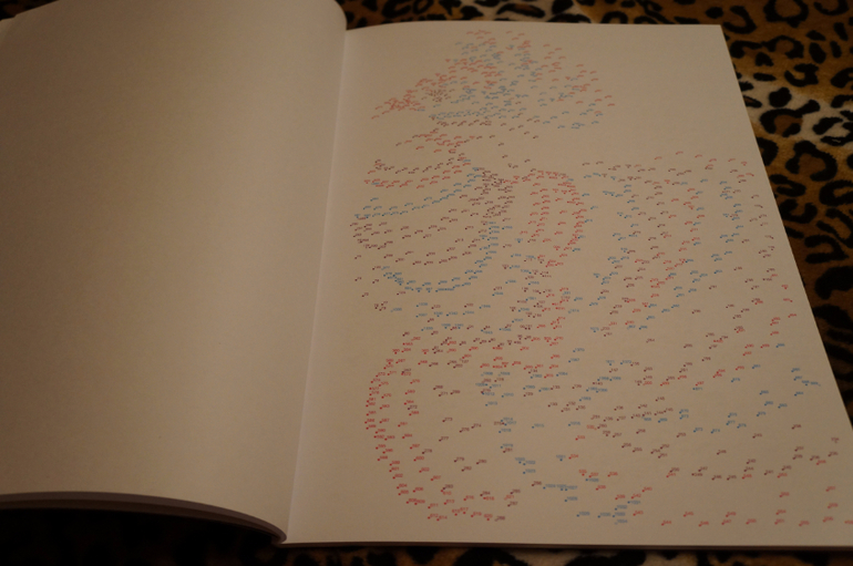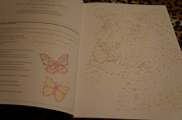 Изюминка заключается в необходимости думать :) Это не просто соединяем все цифры, как в детской раскраске. Точки показаны разнообразными значками, в зависимости от которых нужно соединить линию или прервать. На первой странице есть подробная инструкция и графический образец.