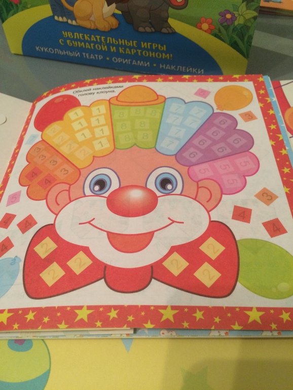 И есть несколько бумажных страниц с заданиями. Например сделать мозаику (наклеки - квадратики прилагаются):