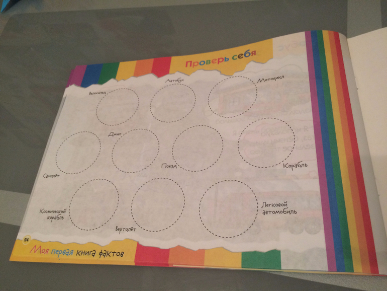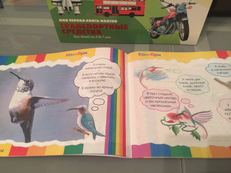 В альбоме 24 страницы, на каждом развороте рассказывается об одном виде транспорта/птиц. Например: