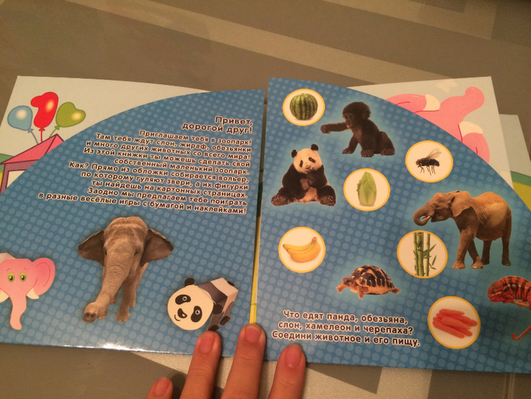 На обратной стороне "пола" правила работы с книгой и игра - в Зоопарке - кто что ест, в Цирке - изображение цирковых артистов.