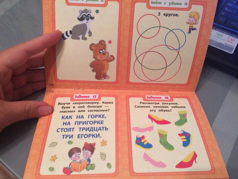 Книжка маленького формата - удобно в дороге. Её можно разрезать на карточки, а можно использовать как есть. На одной стороне задание, на обратной стороне - ответ. Примеры задания для 6 лет можете посмотреть на фото. Мне понравились - достаточно интересные и в меру сложные.