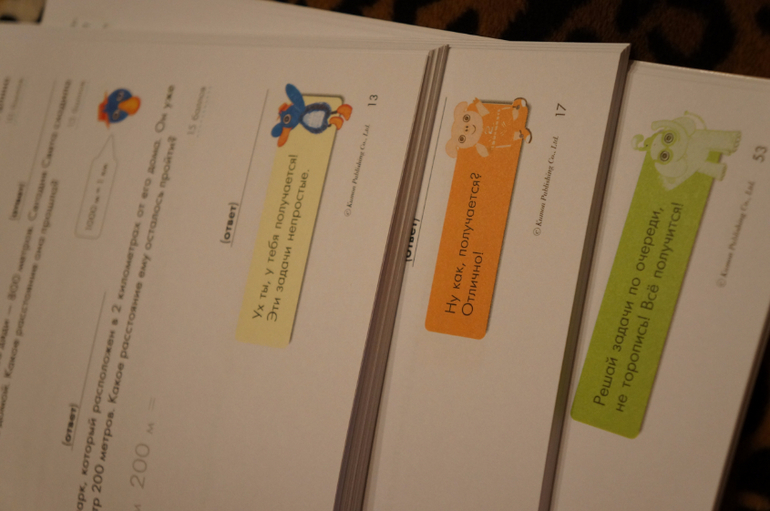 В каждой тетради есть есть хранитель, который подбадривает ребенка хвалебными фразами после каждого урока. В тетради первого уровня это слоненок, второго уровня - поросенок, третьего уровня - утенок :)
