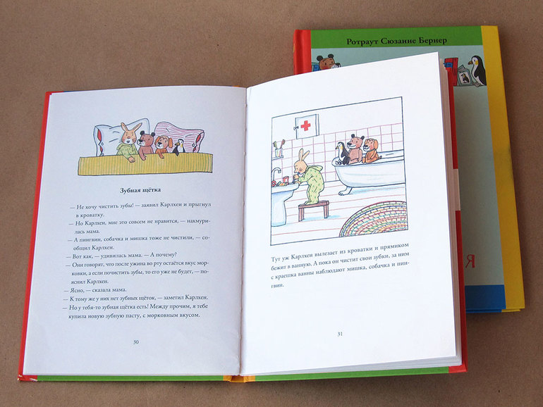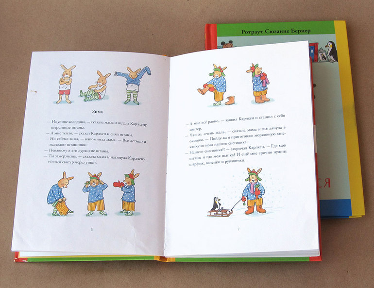 В этой серии много книг для малышей (о них позже), но есть несколько и на возраст от 3 до 5-ти. Если в «малышковом Карлхене» на книжку приходится один рассказ, то здесь другая история, здесь много коротких рассказов о зайчике Карлхене и его семье.