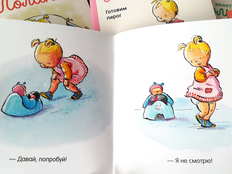 И самое главное, они очень-очень-очень милые, спасибо и автору и художнику. Легкие рисунки, как воздушные зарисовки, и такие же тексты. Все со вкусом! И это я ценю в книгах прежде всего, считаю, что детям нужны качественные, красивые книги, а не просто «чтобы были». А ведь так много страшных книг, поражаюсь! В них с текстами может быть все в порядке, но вот визуально смотришь и хочется плакать. Потому и радуюсь сокровищам, вроде этих книжечек про Полину.