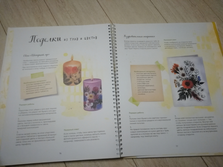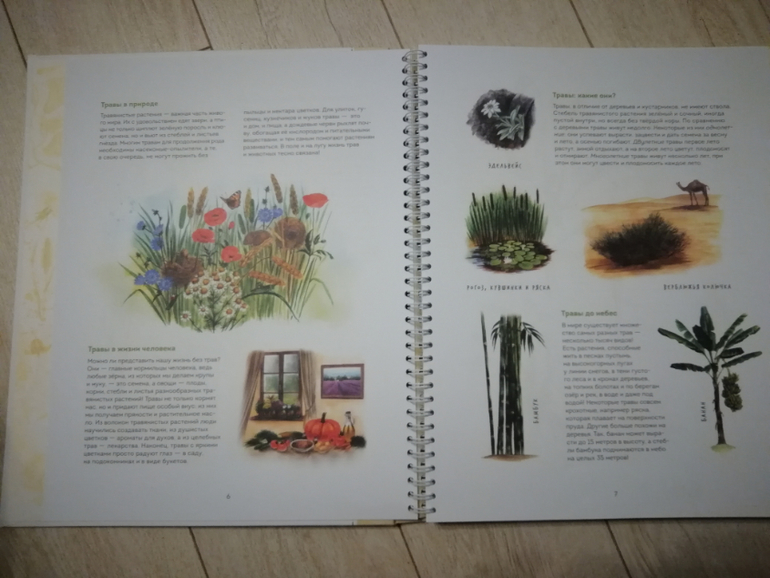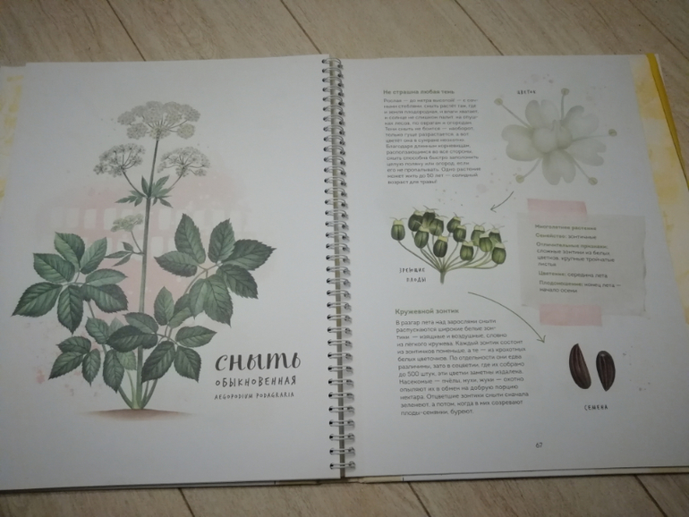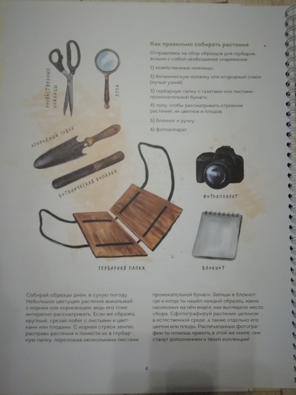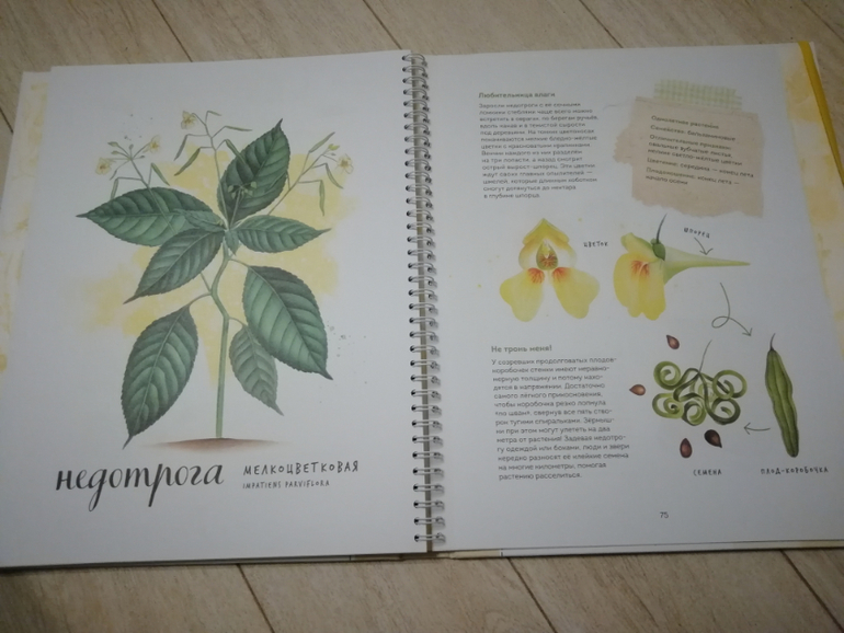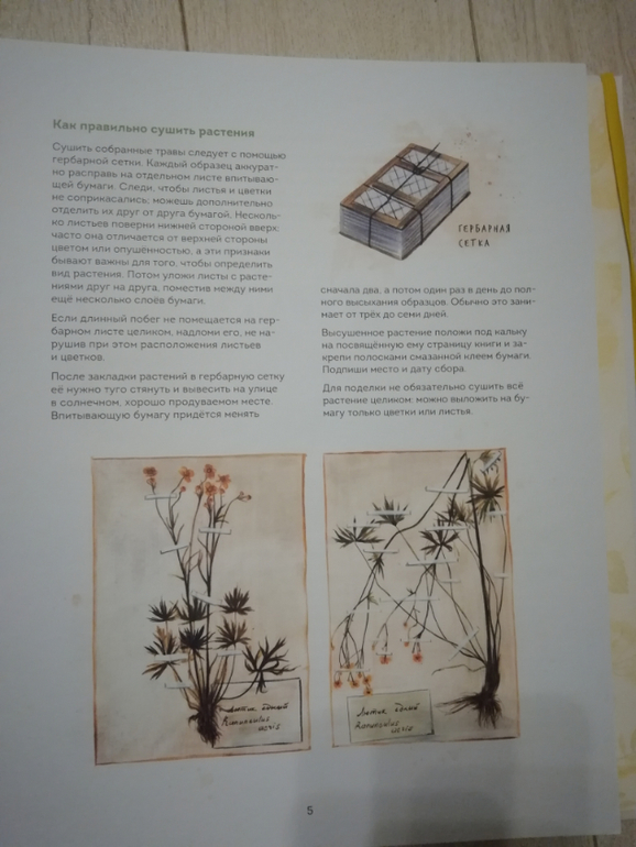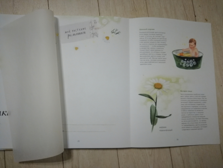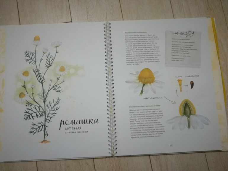 У меня в руках шикарная книга подарочного оформления- Цветы и травы. В ней собрана информация по 16 растениям, таким как: мать и мачеха, лютик едкий, одуванчик, ромашка аптечная, чистотел, мятлик луговой, пастушья сумка, горошек мышиный, вьюнок полевой, клевер луговой, цикорий обыкновенный, подорожник, тимофеевка луговая, сныть, крапива двудомная, недотрога мелкоцветковая. По каждому растению есть подробное описание, интересные факты, подробнейшие иллюстрации самого цветка, плодов и семян. Но это еще не все. К каждому растению есть страничка под калькой, куда можно приклеить свой гербарий этого растения! Идея просто замечательная! Мы уже начали собирать и сушить цветочки, чтобы потом приклеить их в эту книжку. Закрывается книга на резинку, так что гербарий не растеряется при переноске книги. Так же в книге есть подробные инструкции как делать гербарий, описаны необходимые инструменты. Два разворота уделено энциклопедической информации по общему строению цветка, его листиков и корня. Такая книга станет прекрасным подарком юному исследователю биологии.