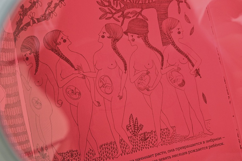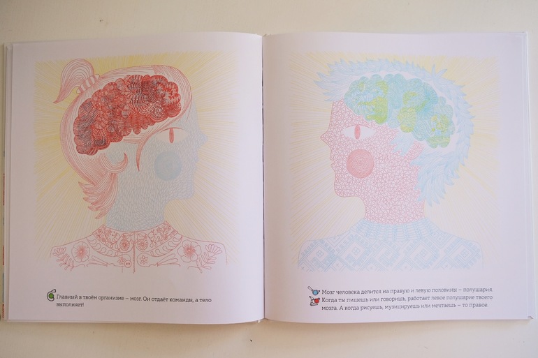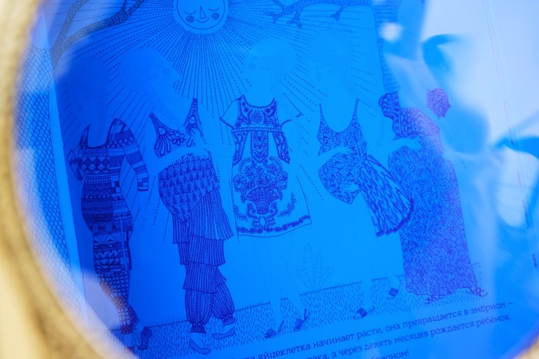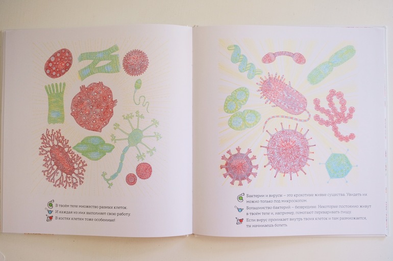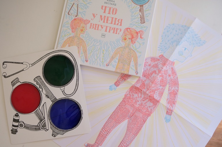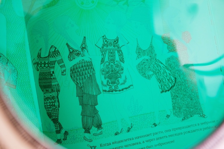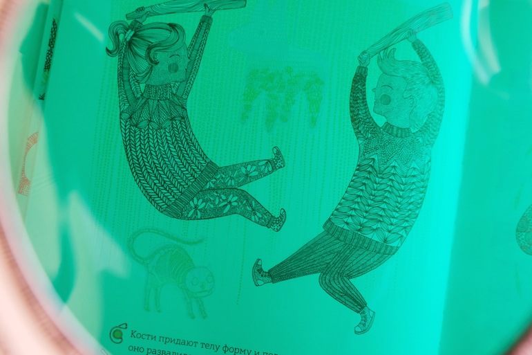Каждую картинку сопровождают полезные заметки о теле человека, его органах, клетках. Причём, каждая заметка соответствует тому, что мы видим через определенный цвет. Порой, сменив всего лишь одну линзу, видишь совершенно другое изображение. И дети в этот момент просто замирают от удивления. А затем продолжают менять линзы, листать книгу и удивляться всему тому, что есть внутри каждого человека.