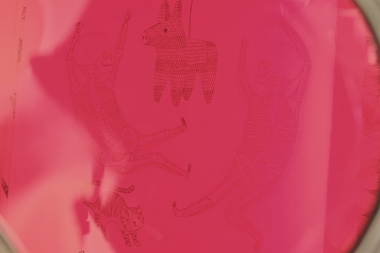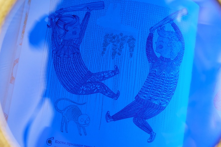 Все изображения нарисованы тремя цветами. И если смотреть на них сквозь разные линзы, картинки будут меняться! Ну чем не магия? Мой сын был с неописуемом восторге, когда посмотрел на плавающих детей сначала сквозь синюю линзу, а потом через красную. Ведь люди на картинке превратились в скелетов!