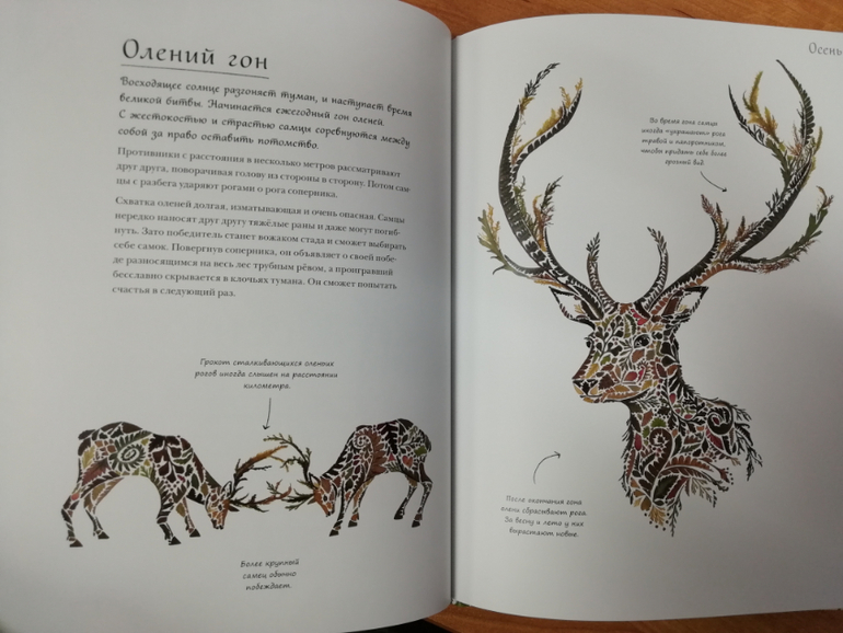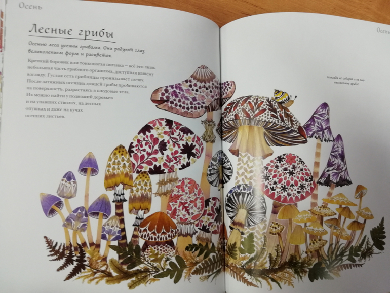 Книга «Год в лесу» полностью проиллюстрирована с помощью коллажей из растений, даже паутинка у паука сделана из растений. Книга поделена на четыре раздела по временам года. Что удивляет, год начинается почему-то с весны, а не с зимы как принято считать: