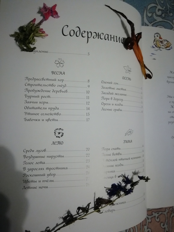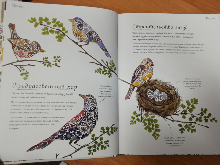 Как я уже говорила, книга поделена на четыре части по временам года. Первое время года в книге-весна. Из книги ребенок узнает как меняется природа в лесу во время каждого времени года. Информация стандартная: Весной просыпается природа, прилетают птицы и появляются первые цветы, птички начинают вить гнезда и петь свои чудесные песенки. Летом становится жарко, летает и ползает много насекомых, распускаются цветы, все вокруг становится радужным и красивым. Осенью опадают листья, животные готовят запасы к зиме, в лесу поспевают орехи и ягоды, растет много грибов . Зимой некоторые животные впадают в спячку, птицам тяжелее становится добывать себе пропитание.