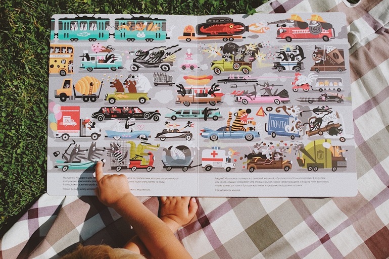 Так как это не просто книжка, а настоящий виммельбух, в котором история рассказывается в основном картинками, подойдёт она даже самым маленьким деткам, которые будут долго разглядывать иллюстрации и изучать забавные приключения курьера Чуни.