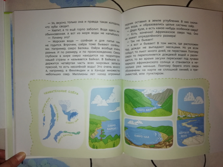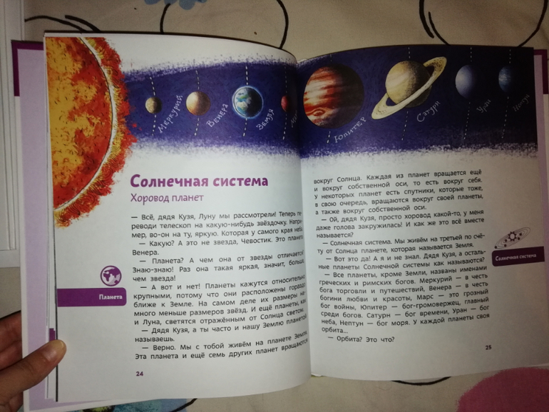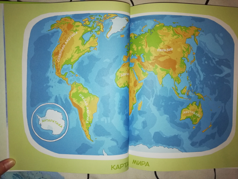 Из книги ребенок узнает, что наша Земля состоит из суши, морей и океанов, рассмотрит материки нашей планеты на карте мира. Познакомится с таким сложным понятием как атмосфера и узнает что такое параллели и меридианы, что такое моря и океаны, что такое цунами и штиль, почему дует ветер, что такое горы и равнины, каков рельеф нашей планеты, что такое айсберги, что находится под землей, что такое вулканы и почему они извергаются. В общем, рассмотрены основные вопросы, которые нужно знать ребенку о нашей планете и все, что ему можно быть интересно на эту тему. У моих детей после чтения энциклопедии вопросов не осталось, они узнали все что хотели о нашей планете.