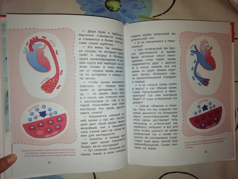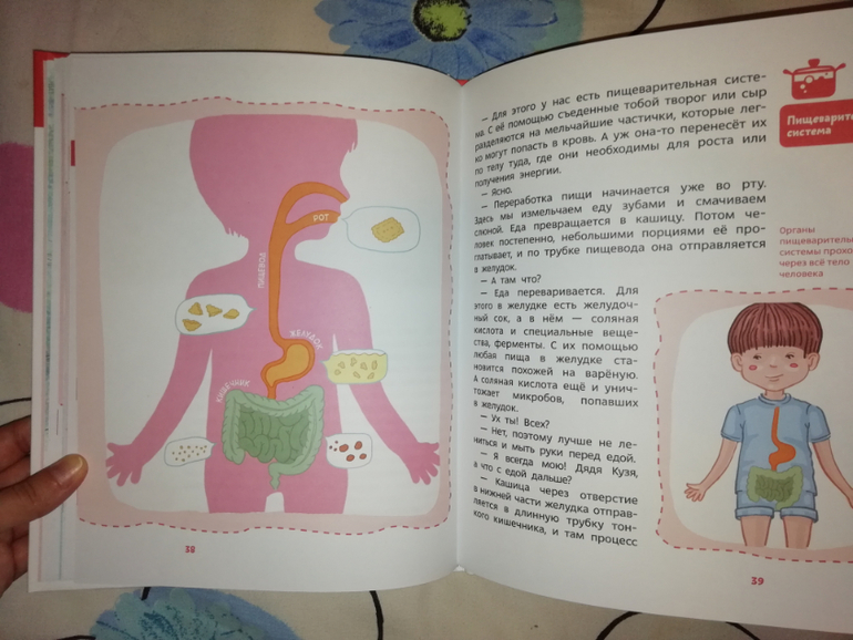Из энциклопедии ребенок узнает какие внутренние органы есть у человека, как они устроены и как они работают. Ребенок узнает как бьется наше сердце, как течет кровь по венам, как мы дышим, зачем нам легкие, как надо заботиться о зубках, что такое пищеварение, какую еду нужно кушать, чтобы получать все необходимые витамины, что такое мышцы, кожа и скелет, как устроен наш мозг, за счет чего мы слышим и видим. Тело человека рассмотрено очень подробно, но в отличие от подобных энциклопедий, в книге "Как устроен человек" не только показывается как устроен человек, но и рассказывается как работают наши органы, почему они так устроены, как они взаимосвязаны между собой. Даже мне, взрослой тете было интересно читать эту книгу детям. Я не очень сильна в биологии и анатомии, а эта энциклопедия помогла мне в доступной форме рассказать и показать детям как они устроены и ответить на все их вопросы почему.