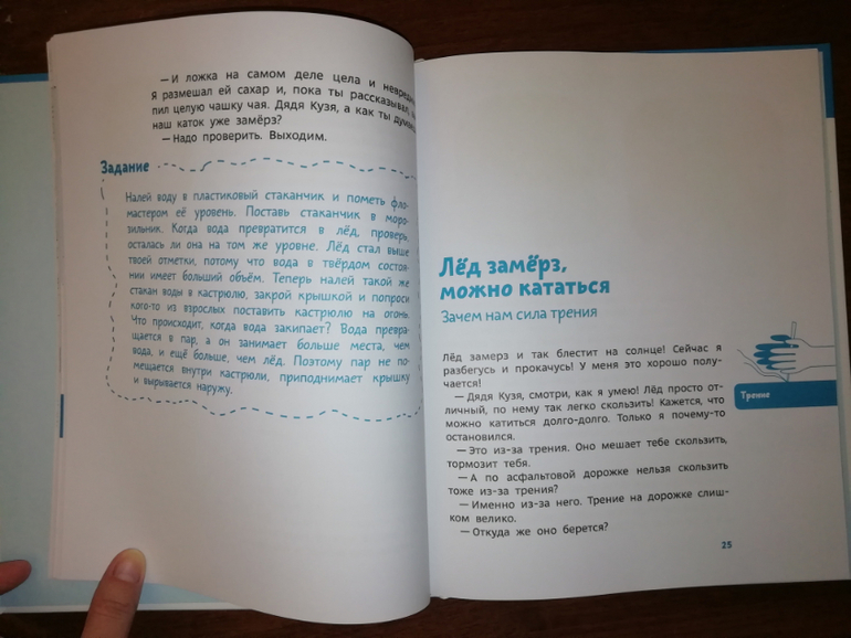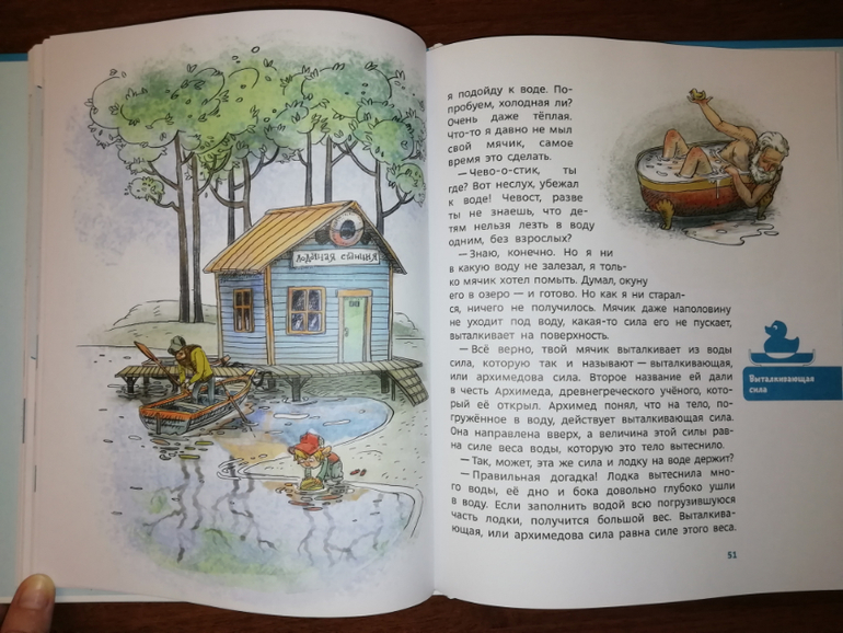 Из книги дети узнали (а я освежила память) о основных законах физики таких как сила трения, инерция, сила притяжения, основные понятия о электричестве, скорости света и звука, состояниях вещества. Вся информация очень интересно и просто написана, дочка усвоила ее хорошо, несмотря на возраст. Мы провели несколько эксперементов с водой и льдом, с помощью мячика в действии изучили закон инерции и силу притяжения. Сын вспомнил как мы ходили в Эксперементариум, сколько там было много интересных экспонатов, а главное, что их все можно было потрогать и они очень наглядно демонстрируют законы физики. (А ходили мы в этот музей, когда он еще был в садике и ему было шесть лет!). В планах, конечно же, еще раз посетить этот музей. Дети поняли что такое физика, поняли как работают основные физические законы, провели свои эксперементы и прекрасно провели время. Я вообще заметила, что любая тема, даже самая сложная, если рассматривается на простых, понятных детям примерах, она очень захватывает, а когда про эту тему рассказывает любимый персонаж (Чевостика мы нежно любим уже несколько лет, очень надеюсь, что когда-нибудь выпустят мягкую игрушку или хотя бы фигурку Чевостика) это становится вдвойне увлекательнее.