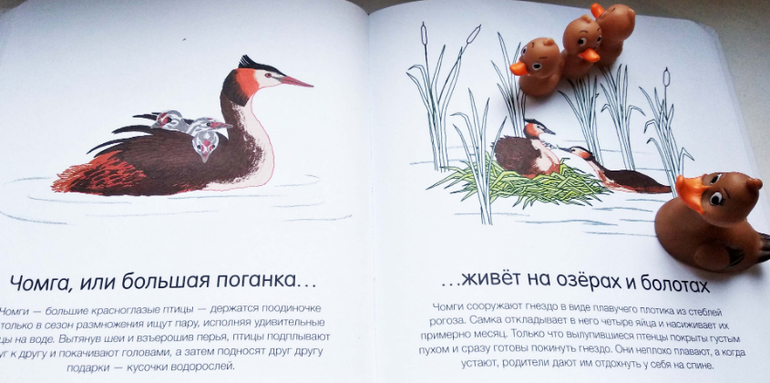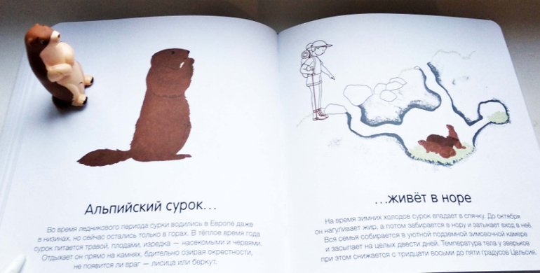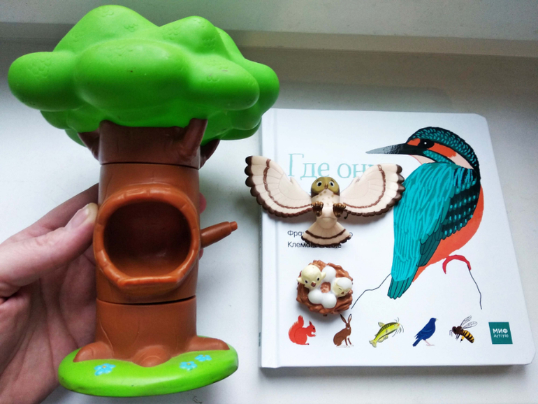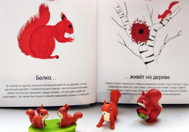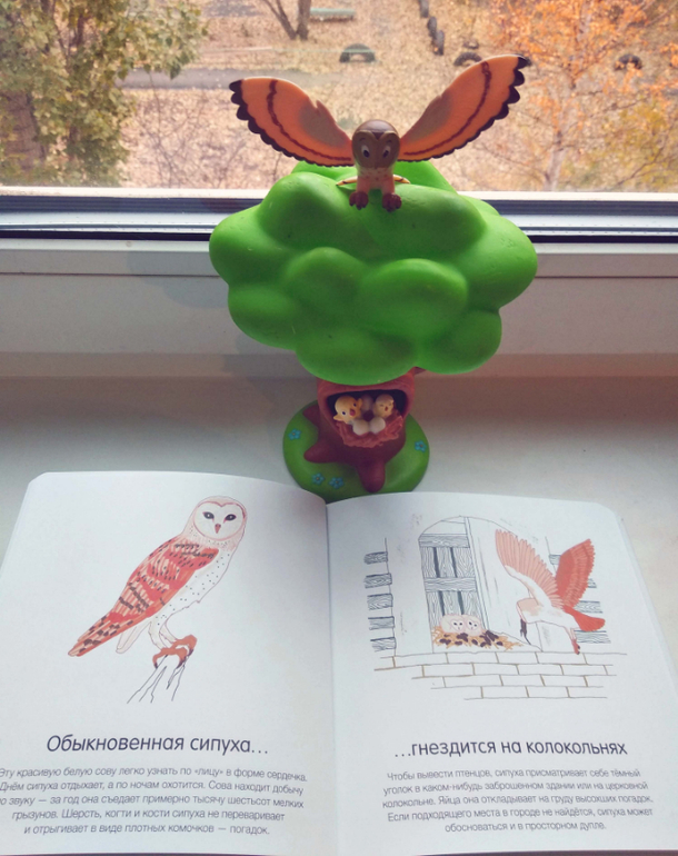Книга небольшого размера, но очень удобного формата. Удобно держать в руках. Края закруглены, книга лёгкая. Одно удовольствие держать и читать с ребенком. Но! Конечно же главная интересность внутри! Причем нам с ребенком было двойное удовольствие - большинство картинок зверей у нас оказались продублированы фигурками данных животных! О, какой кайф ребенку доставлял процесс сопоставления - а у меня и белки есть! И медведи! И крот! И утки! И совы!!! Причем в книге то как раз жилища зверей, с детёнышами. И у нас оказались детёныши. В общем читали, играли, обустраивали домики-жилища! А сипуха вообще без комментариев! Хохотали всей семьёй! Над ее гнездованием - как она отрыгивает непереваренные кости - погадки - и из этого делает гнездо. У нас ведь и дерево есть с дуплом, и совята в гнёздышке, и сама сова! Когда 3 летний ребенок играет - изображая сипуху, вьющую гнездо из погадок - на это можно смотреть и смеяться бесконечно!!! В общем - дальше только картинки, приятного просмотра!