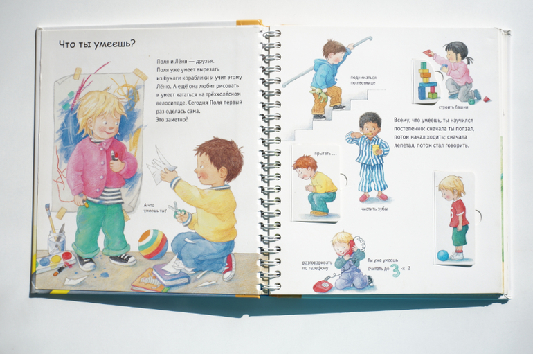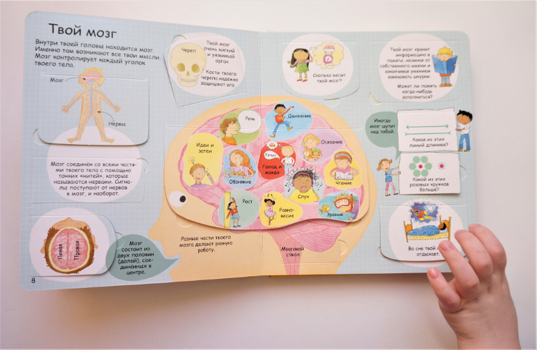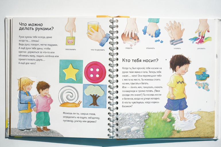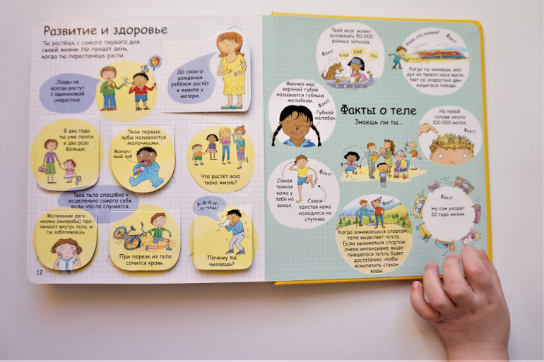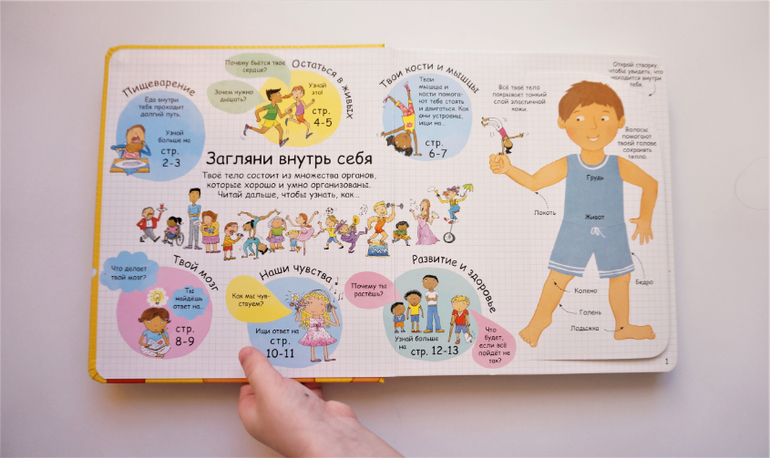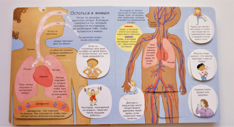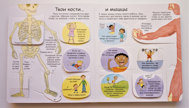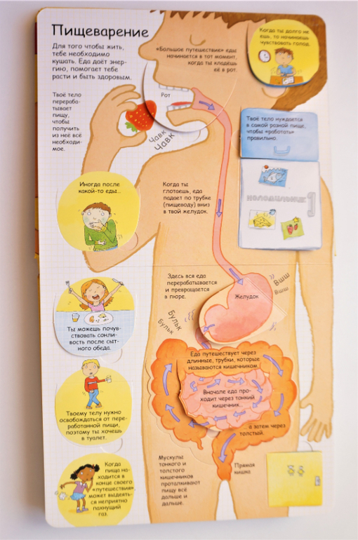 Далее уточняем информацию о теле более подробными ответами про то, куда девается в организме еда, а что такое кости и мышцы и т.п. И снова окошки, и снова интересная и достаточная подача информации на этот раз для детей 3-5 лет - Секреты человека издательства Робинс. Тут уже можно идти исключительно от интереса ребенка и на каждый вопрос или ситуацию доставать эту книгу и смотреть ответы, и обязательно показывать на малыше. Она содержит ответы на множество почему, причем без длинных лекций и кучи причинно-следственных связей. Просто и по делу, но затрагивает много-много аспектов по тематике человеческого тела.
