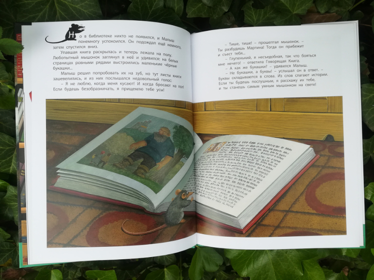 И сразу загадка для любопытного мышонка - в доме живет страшный и опасный Мартин. Кто он и как выглядит? Малышу предстоит познакомится с ним. Но до этого будет не менее значимое в жизни мышонка знакомство с Говорящей книгой, черные буквы которой Малыш сначала принял за букашек и даже хотел съесть, которая научила его грамоте и открыла перед ним удивительный мир чтения. Она рассказала ему о морях и океанах, об отважных путешественниках, которые открывали новые земли, о пиратах, ищущих сокровища, о дремучих лесах и драконах, о принцессах и рыцарях.