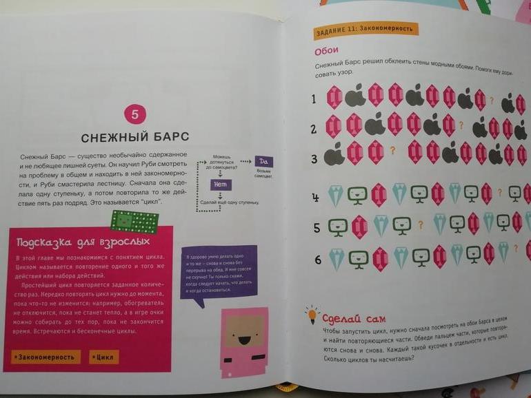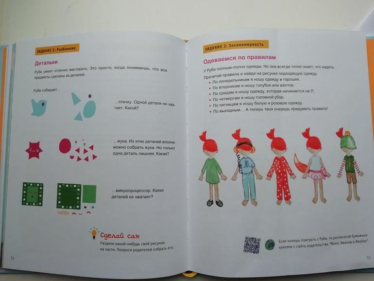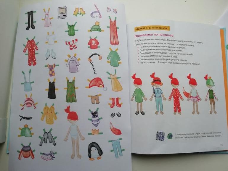 Я бы сказала, что выполнение заданий хорошо развивают логику. На фото ниже в одном задании общая картинка раскладывается на детали и нужно понять чего не хватает в нарисованные деталях либо т о лишнее. Второе задание, по описанию понять что одевает Руби вв определённый день недели. Например, по четвергам она носит головной убор. Нужно найти соответствующую картинку.