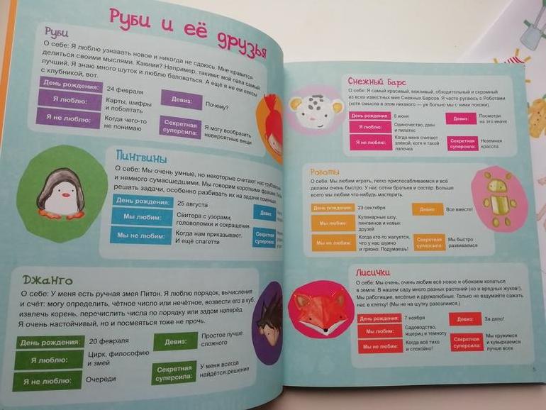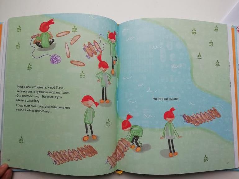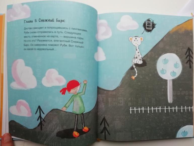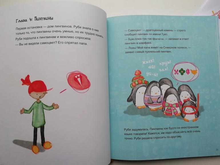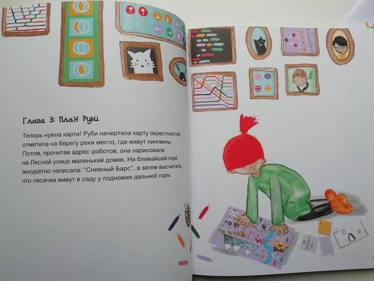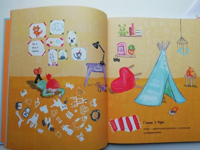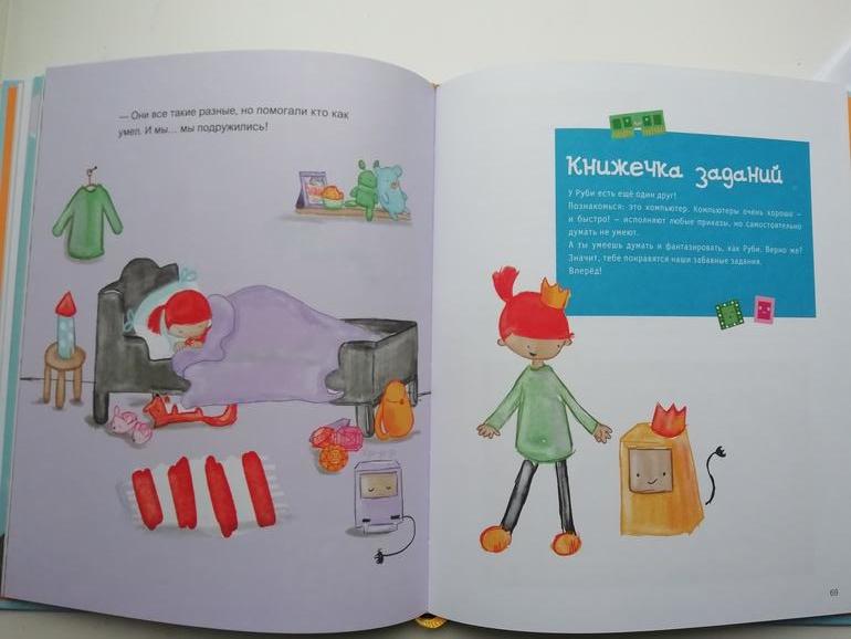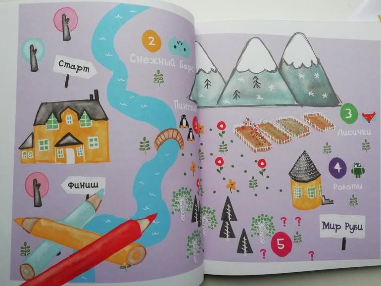 Сама книга среднего формата в твёрдой обложке с ляссе и яркими иллюстрациями. Книга поделена на две части: в первой части мы знакомимся с девочкой Руби и её друзьями и читаем саму историю, а во второй части напечатаны задания к прочитанных главам. Читать книгу можно несколькими способами, можно сначала прочитать все главы, а потом уже приступать к заданиям, либо выполнять задания сразу после прочтения главы. Мы выбрали второй вариант.