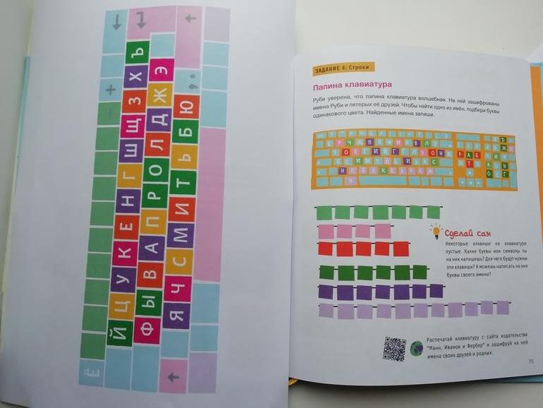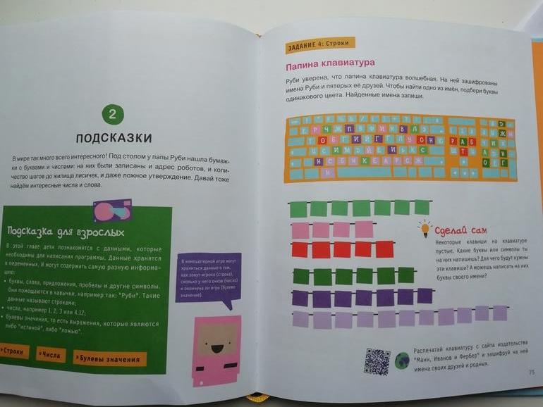 Во втором задании нужно с помощью клавиатуры с цветными клавишами определить что за слова на ней зашифрованы. Так же есть задания на количество предметов на примере чаепития Руби и учимся определять по утверждения истину и ложь. К каждой главе идёт несколько заданий.