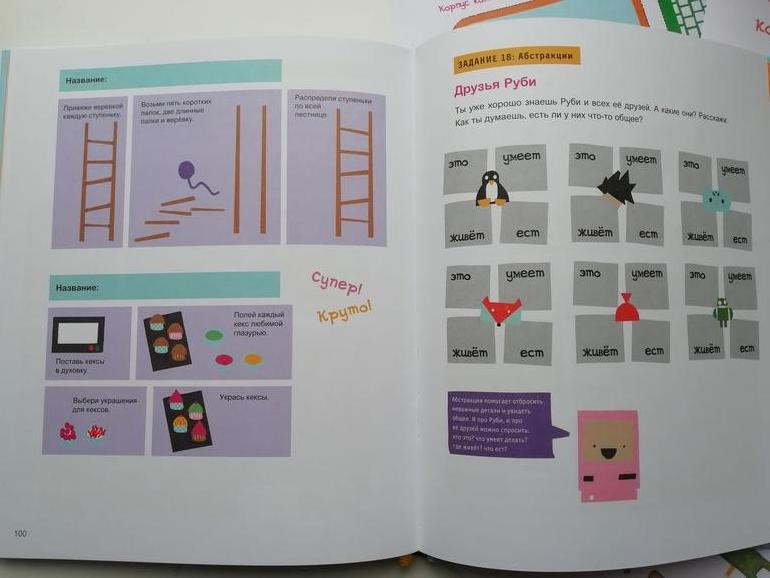 Выполнив все задания в книге ребёнок познакомится с такими сложными понятиями, как последовательность, разбиение, закономерность, строки, числа, булевы значения, алгоритм, структуры данных, цикл, ветвление, творчество, функции, абстракции, отладка, парное программирование. При этом никаких сложных понятий, ребенок просто выполняет интересное задание