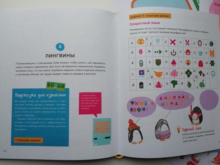 После главы про пингвинов мы знакомимся с таким понятием, как структура данных и выполняем задание по расшифровке слов пингвинов.