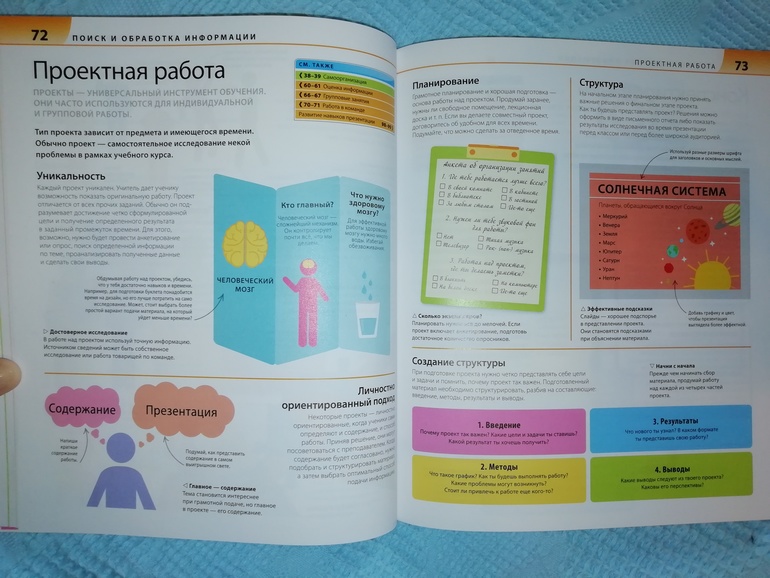 Следующий раздел посвящен поиску и обработке информации. Вроде казалось бы, в наш цифровой век детям намного проще искать информацию, им не нужно идти в библиотеку, чтобы написать реферат -есть интернет. Но, сын почему-то не очень умеет искать информацию. В этом разделе рассмотрены вопросы поиска информации, автор предлагает искать информацию в библиотеке. На мой взгляд, пользоваться библиотекой ребенок, конечно, должен уметь, но не пользоваться возможностями интернета как-то глупо. Я учу детей искать информацию в сети, проверяя ее в нескольких источниках.