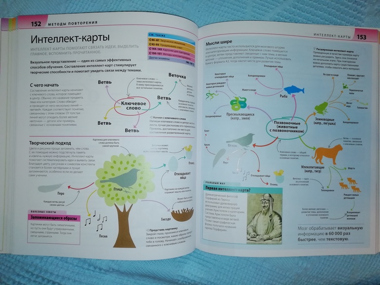 Следующий раздел посвящен методам повторения. На фото ниже мои любимые интеллект-карты, считаю это метод прекрасным помощником не только в запоминании, но и в объяснениях каких-то сложных тем. Сама часто использую на работе во время мозговых штурмов.