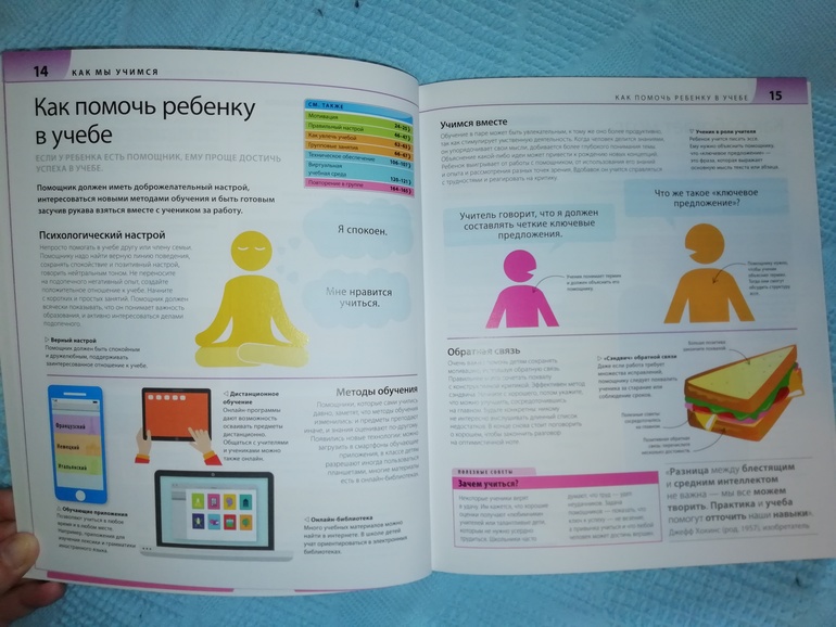 Оформление у книги серийное, она большого формата, в интегральной обложке (кажется это так называется), с большим количеством изображений и схем, которые называются инфографики. В книге много информации о том, какие навыки нужны детям, для того, чтобы они успешно учились.