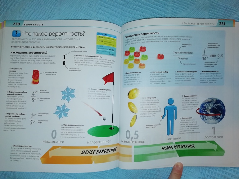 Следующий раздел-вероятность. Этот предмет я не проходила нигде, ни в школе, ни в колледже, ни в институте. И, естественно, чтение книги я начала именно с него. И скажу я Вам, довольно-таки интересный предмет. Думаю, что мы с сыном изучим его самостоятельно, так как я вижу большой потенциал развития логики с этим предметом, а она просто необходима будущему программисту.
