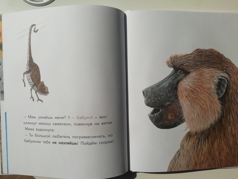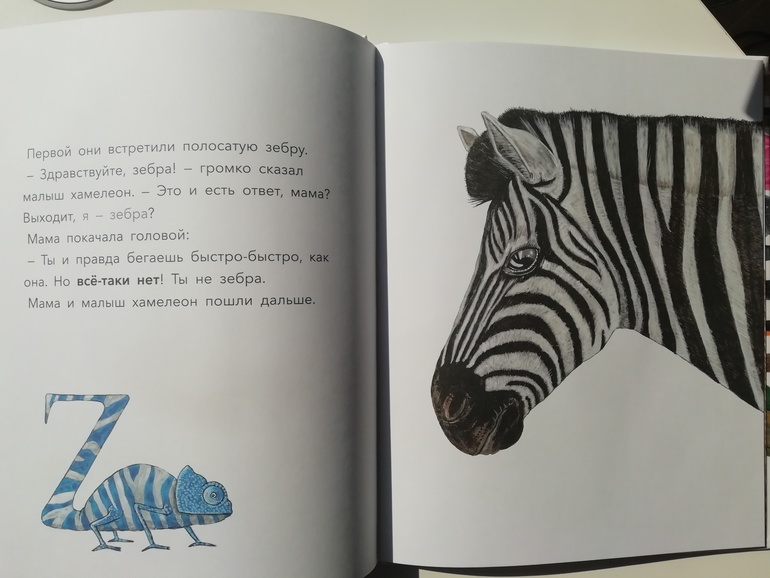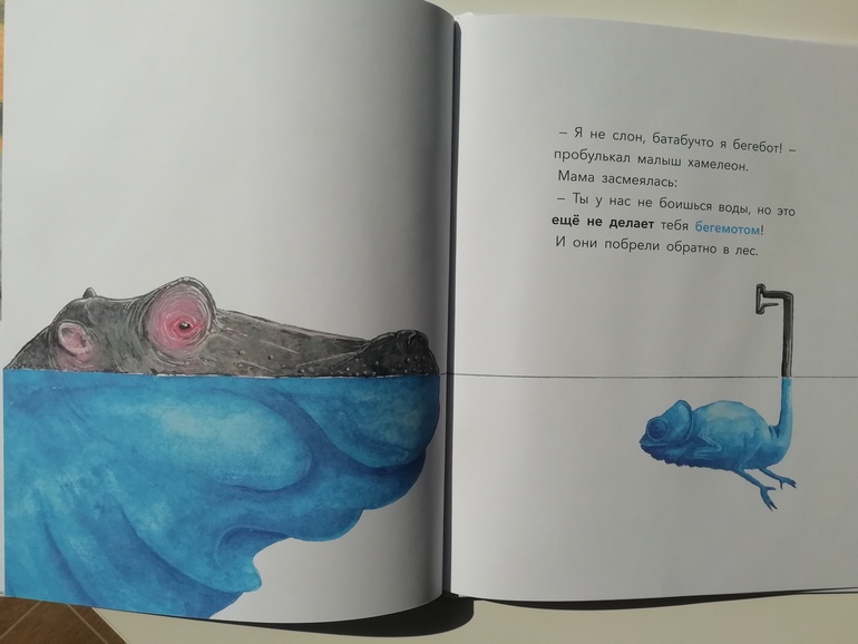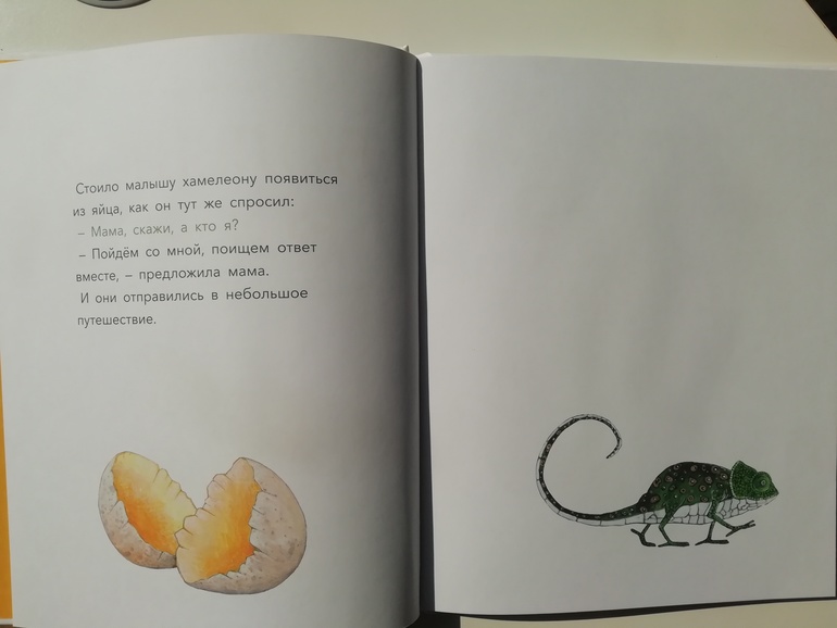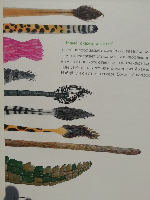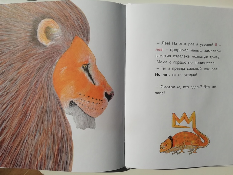 На своем пути они встречали много разных животных и птиц, хамелеон сразу же принимал такой же цвет, как и они и спрашивал маму : "Я зебра? лев?", но мама каждый раз отвечала, что он такой же быстрый как зебра или такой же мечтатель как фламинго, но он другой.