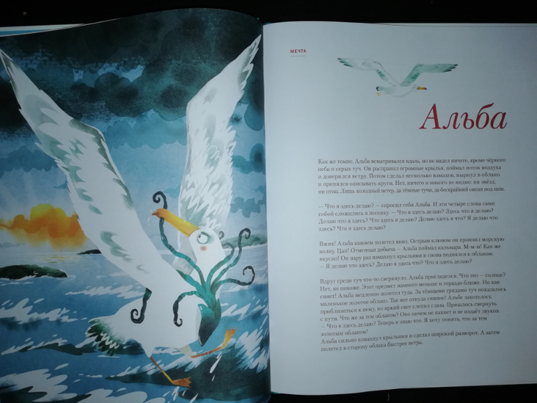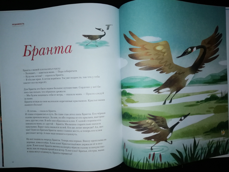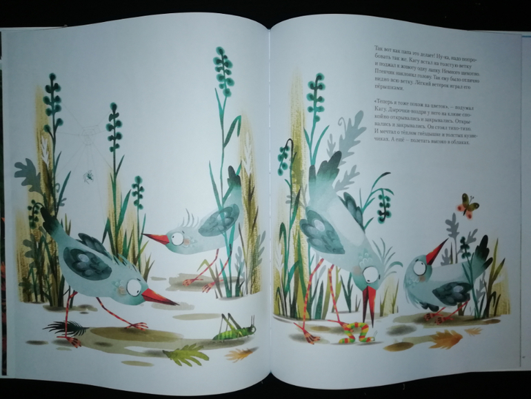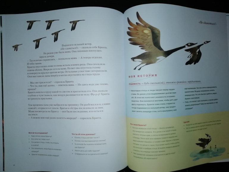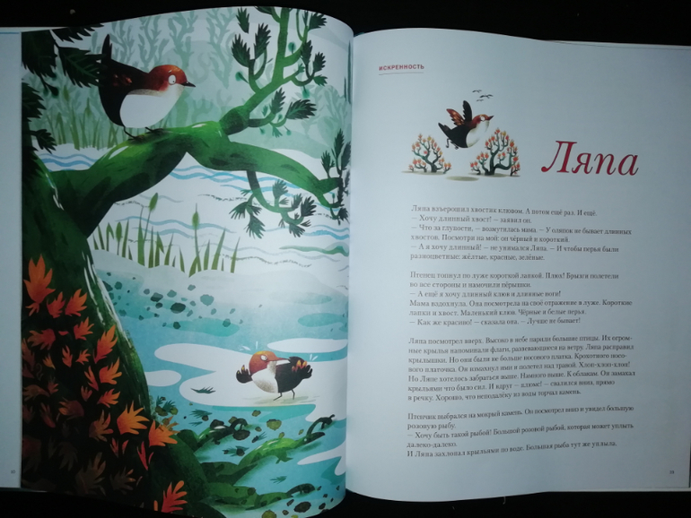 Как я уже писала ранее, в книге десять рассказов, все они про разных птиц и посвящены поиску счастья, уверенности в себе, умению дружить, делиться, помогать и другим положительным качествам. Есть небольшие сноски с энциклопедическими знаниями про каждую птичку, где живет, что интересного про нее можно сказать и т.п.