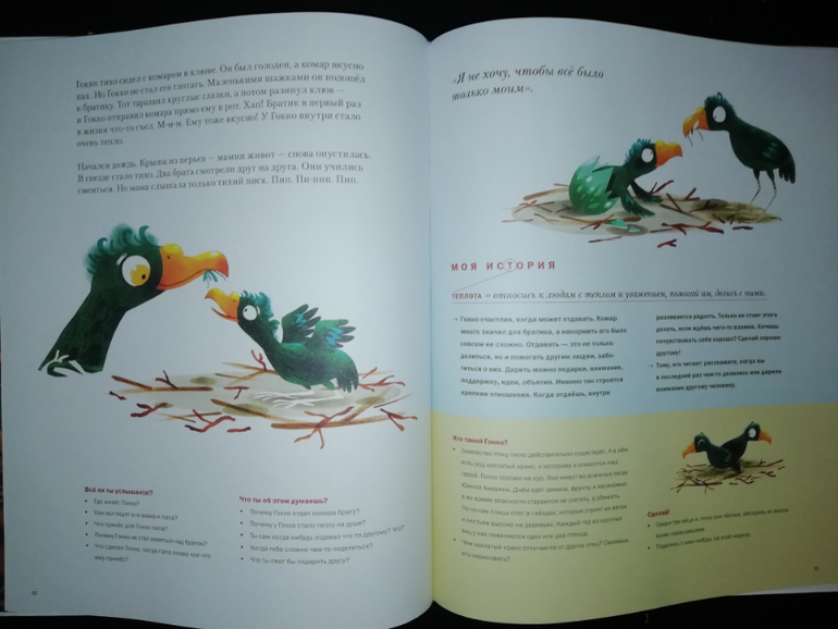 Вот так выглядит каждый рассказ-два или три разворота с самим рассказом и иллюстрациями, а в конце вопросы, чтобы оценить насколько внимательно ребенок слушал и что он об этом думает. Так же есть небольшие задания, они напоминают задания психологов для проработки каких-то проблем, либо открытия каких-либо скрытых качеств.