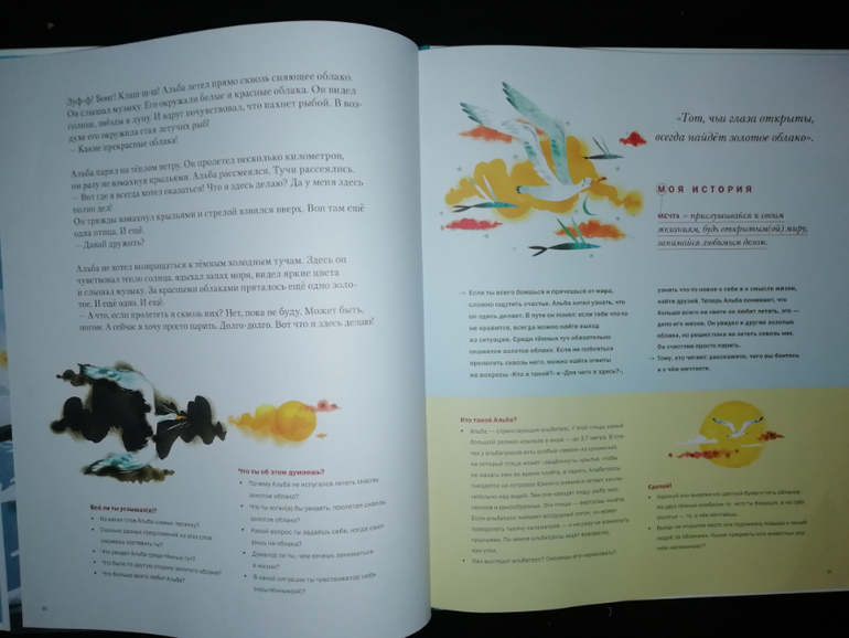 Например, в рассказе про Альбу задание нарисовать пять облаков, два темных (на них написать свои страхи) и три золотых (на них написать свои мечты). Или такой пример, нарисовать солнышко, где в центре сам ребенок, а лучики-это его друзья. Задания необычные, дочка с удовольствием их выполняла.