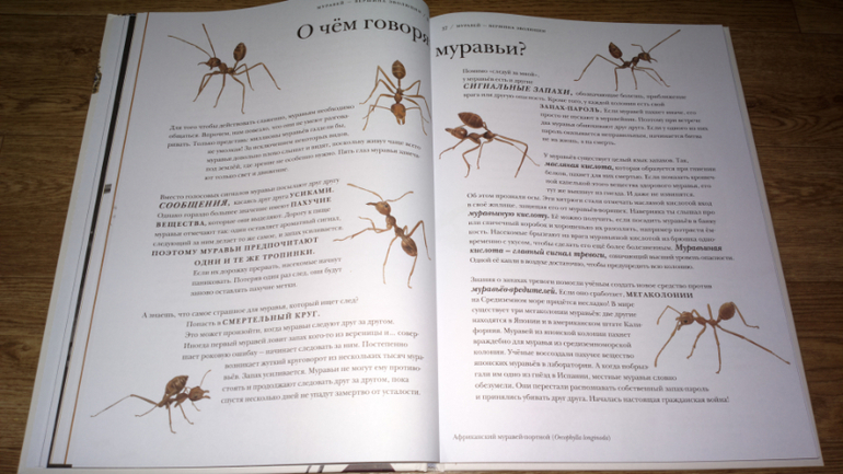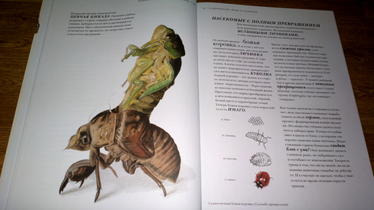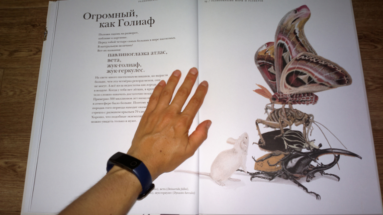 Посмотрите на фото. Автор предлагает положить на разворот свою руку и сравнить её с насекомыми-гигантами, которые изображены в натуральную величину.