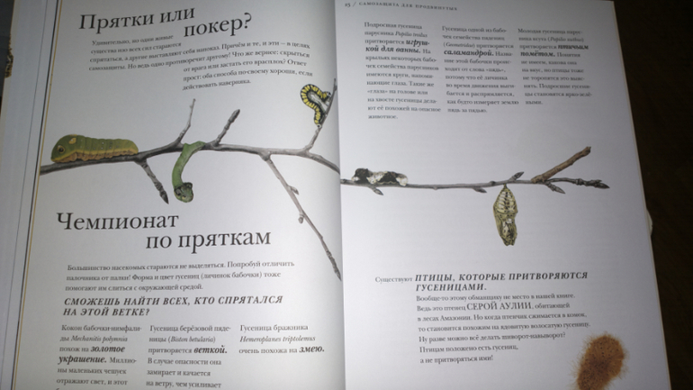 На сайте издательства МИФ можно почитать главу "Самозащита для продвинутых", где собраны интересные примеры удивительных маскировок различных насекомых.